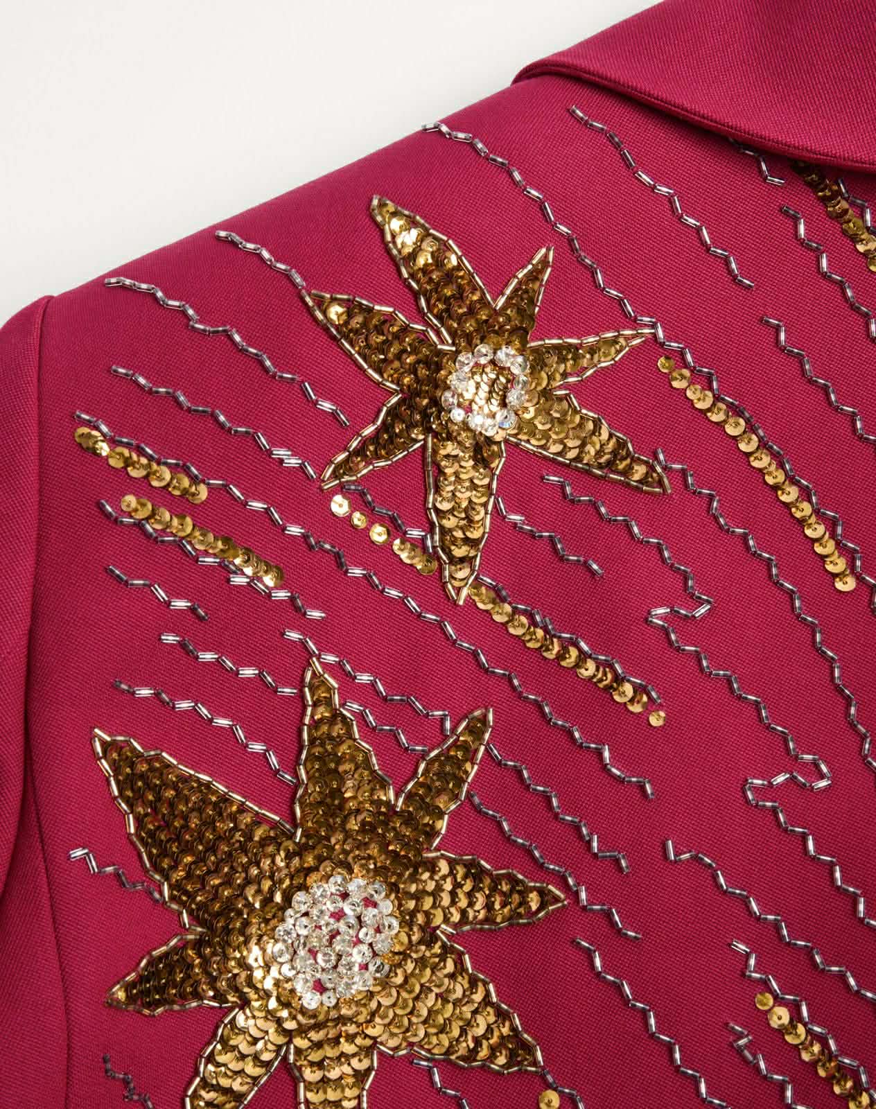 Στο συγκεκριμένο look, το embellished robe jacket με τα χρυσά μοτίβα λειτουργεί σαν στοιχείο φωτός. Η ένταση προκύπτει από τη σιλουέτα και το χρώμα, όχι από υπερβολή.
