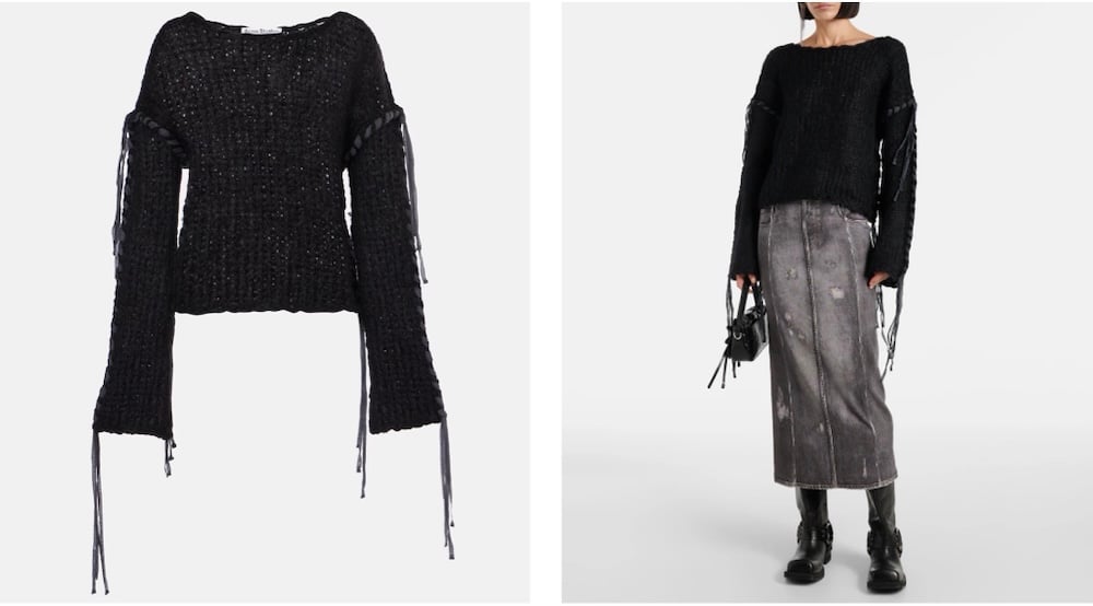 Ανοιχτό πλεκτό σε μαύρο mohair, με χαλαρή γραμμή και λεπτομέρειες φθοράς. Ένα κομμάτι που ενώνει την άνεση με την αισθητική του grunge και μετατρέπει το πλεκτό σε δήλωση στυλ.