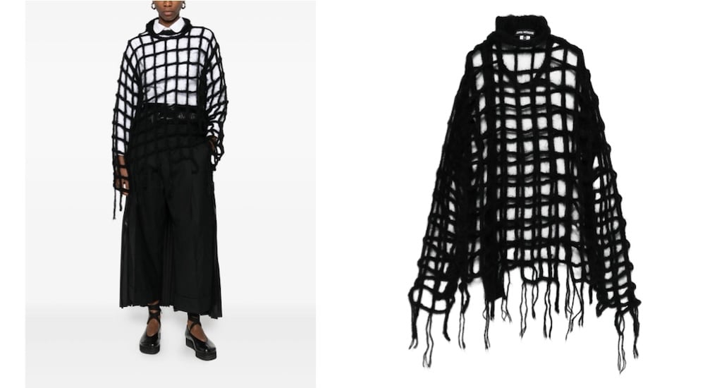 Πλεκτό με γεωμετρικό πλέγμα και φαρδιά μανίκια που καταλήγουν σε μακριές κλωστές. Η ιαπωνική δεξιοτεχνία σε μια αποδομημένη εκδοχή που επαναπροσδιορίζει τη δομή του πουλόβερ.