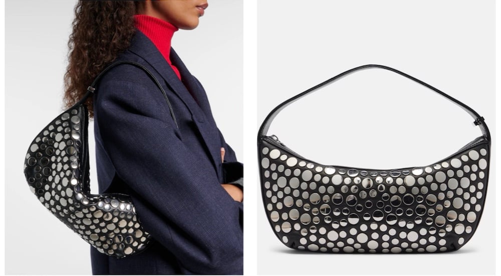 Καμπυλωτή τσάντα ώμου με καθρέφτες και μαύρο δέρμα. Θυμίζει τα early-2000s, αλλά με νέο, minimal twist. Φωτίζει τη σιλουέτα χωρίς να αποσπά την προσοχή.