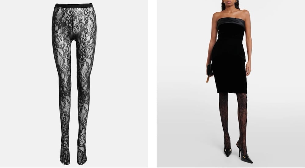 Μαύρα δαντελένια leggings που θυμίζουν couture εσώρουχο των ’90s. Ο οίκος επαναφέρει τη δαντέλα στην πιο τολμηρή της εκδοχή — διαφανή και αισθησιακή.