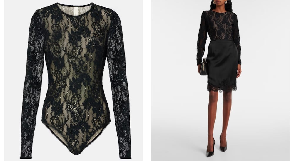 Body από μαύρη δαντέλα, φορεμένο με σατέν φούστα. Ένα κομμάτι που συνδυάζει ρομαντισμό και αυστηρότητα, μετατρέποντας τη διαφάνεια σε τέχνη της ισορροπίας.