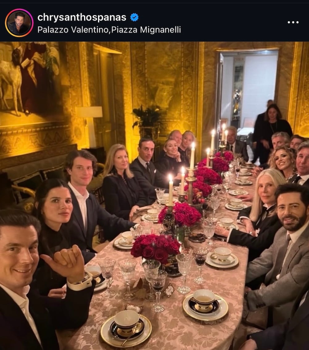 Μετά τα εγκαίνια, η εμπειρία συνεχίστηκε σε ένα ιδιωτικό δείπνο. Όχι σαν κοινωνικό επίμετρο, αλλά σαν προέκταση της ίδιας της έκθεσης. Ένα μακρύ τραπέζι, χαμηλός φωτισμός, πρόσωπα από τον κόσμο της τέχνης και της μόδας που δεν συναντήθηκαν για να φωτογραφηθούν, αλλά για να συνυπάρξουν. Στο κεφάλι του τραπεζιού κάθισε ο Giancarlo Giammetti, ορίζοντας τον τόνο της βραδιάς όχι ως οικοδεσπότης, αλλά ως θεματοφύλακας μιας συνολικής αντίληψης για τη μόδα και τον πολιτισμό. Ο Χρύσανθος Πανάς βρέθηκε σε αυτόν τον κύκλο ως ενεργός συνομιλητής μιας συζήτησης που ξεπέρασε τα όρια της βραδιάς και αφορούσε τον ρόλο της μόδας ως πολιτιστικής πράξης. Η συζήτηση δεν περιστράφηκε γύρω από συλλογές ή τάσεις, αλλά γύρω από το πώς η μόδα μπορεί να λειτουργήσει ως πολιτιστικό εργαλείο, με διάρκεια και ευθύνη.