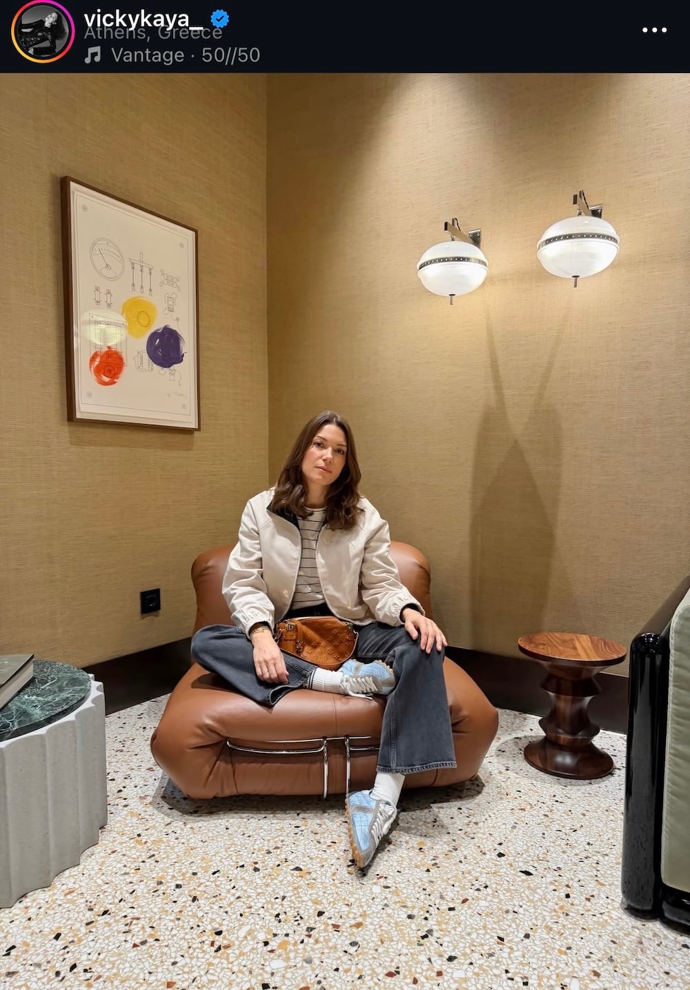 Στις φωτογραφίες της από το Athens Capital Suites, η Βίκυ Καγιά δεν δείχνει να «παρουσιάζει» ένα outfit. Δείχνει να ζει μέσα σε αυτό. Το styling της είναι χαμηλών τόνων, σχεδόν αντι-δηλωτικό, αλλά απόλυτα μελετημένο. Φοράει ένα jacket της Acne Studios σε απαλή απόχρωση, με υφή που αγκαλιάζει το σώμα χωρίς να το περιορίζει. Δεν είναι bomber με την αυστηρή έννοια, αλλά ένα ελαφρύ, βαμβακερό jacket που κινείται ανάμεσα στο casual και στο elevated, προσθέτοντας μια ήσυχη θηλυκότητα στο σύνολο.