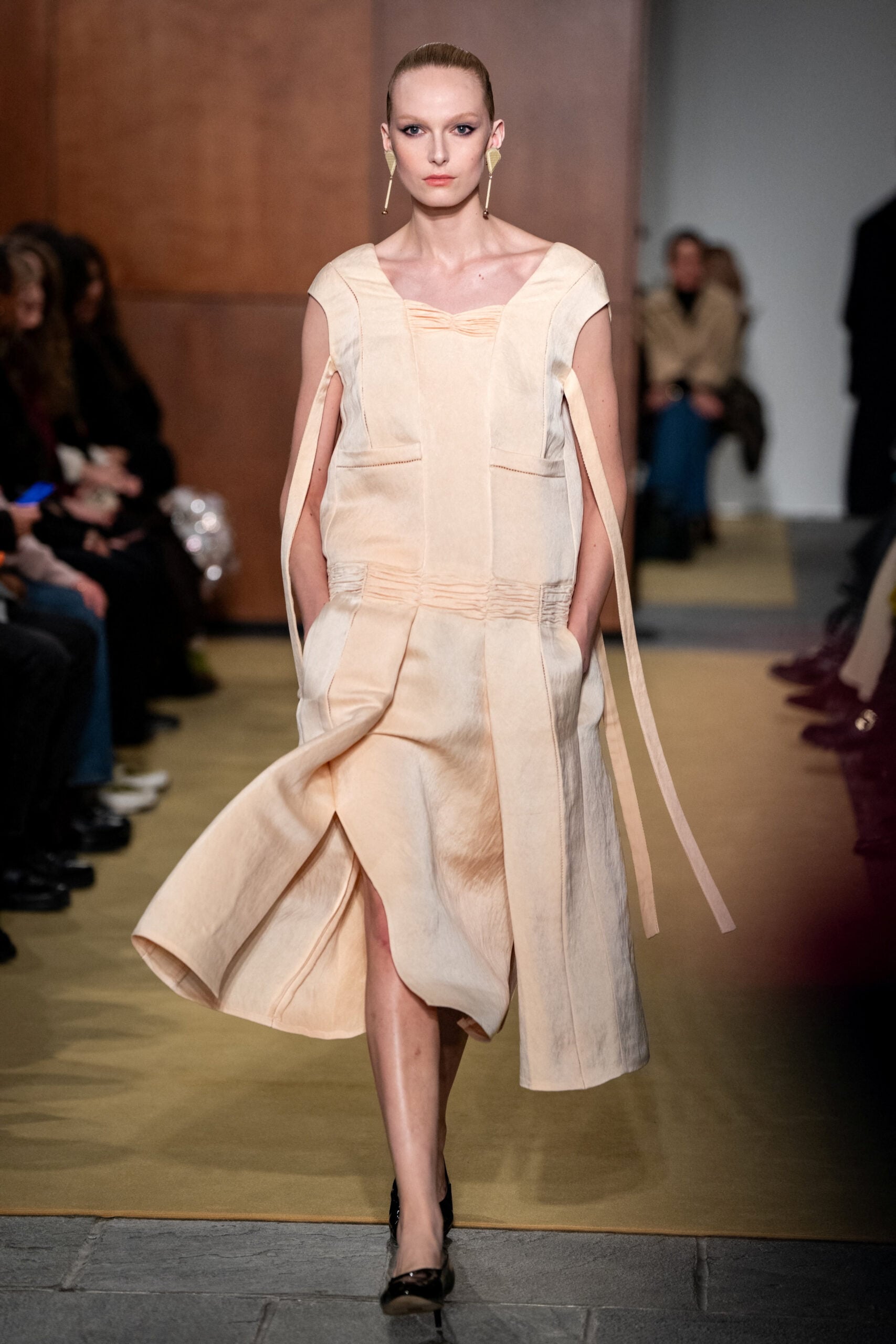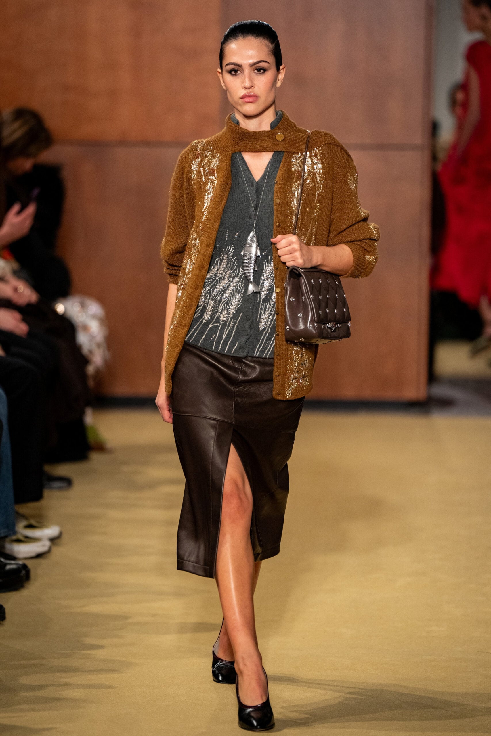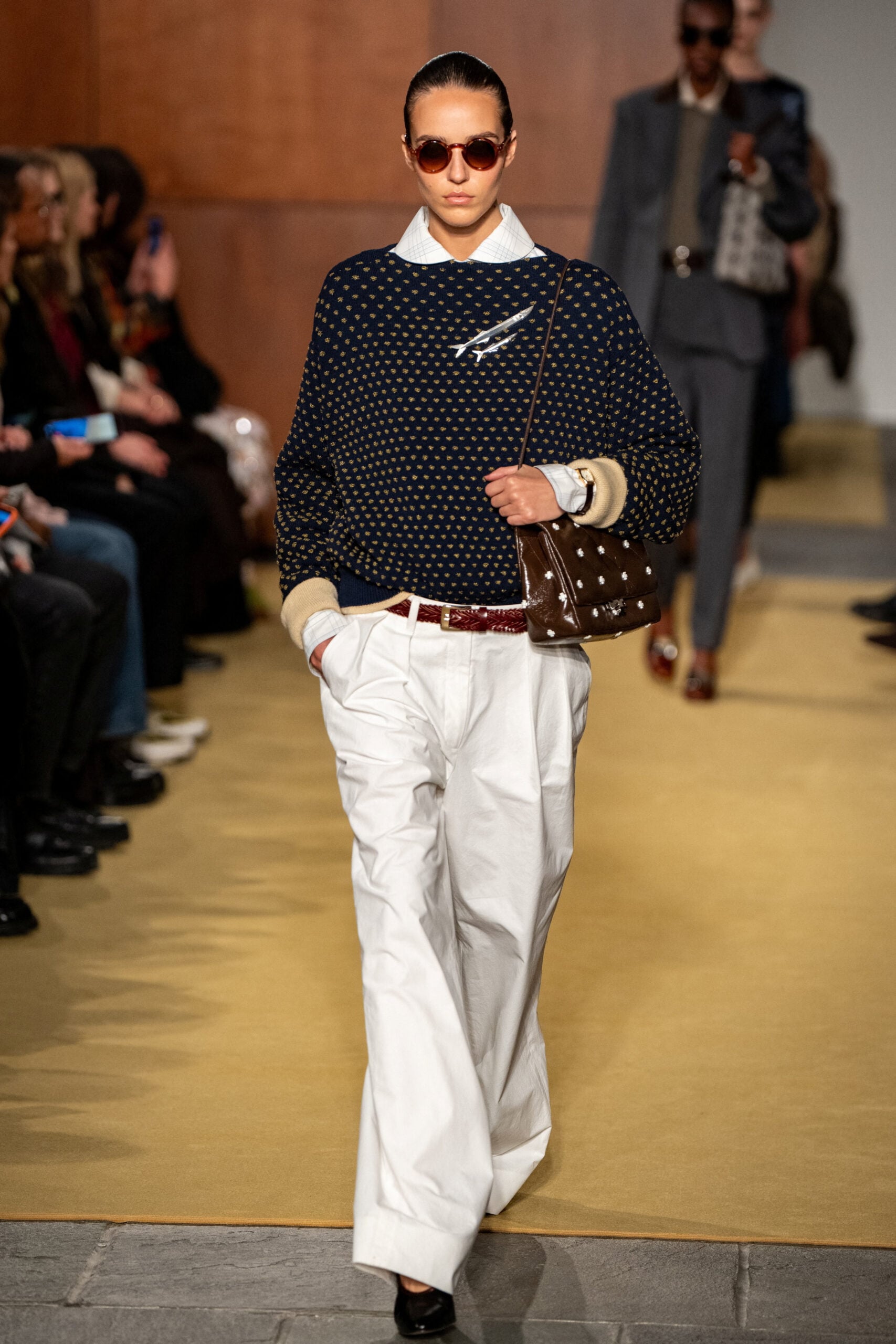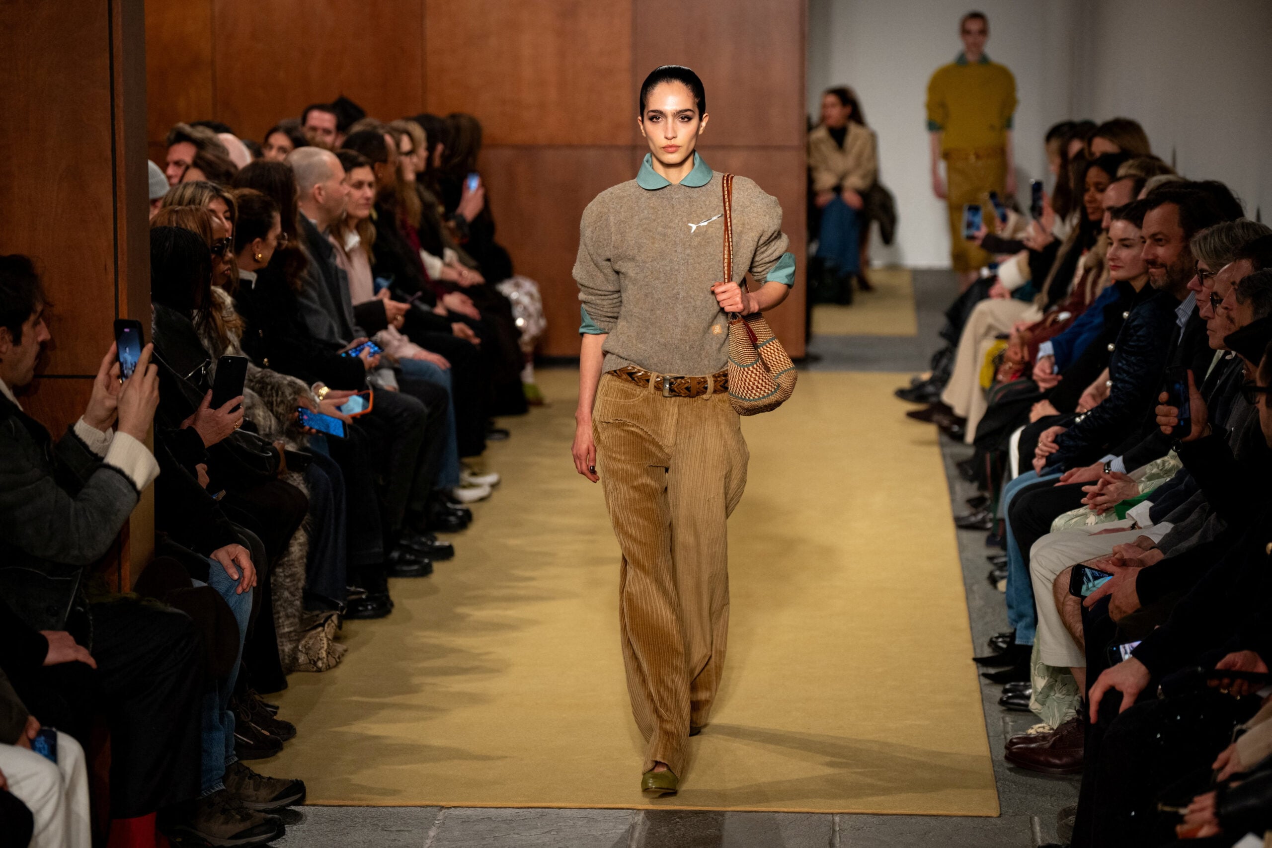 Παράλληλα, η Burch εξερευνά την υφή και την τεχνική: ζακέτες με χειροποίητα κεντήματα, βελούδινα κοτλέ παντελόνια και πουλόβερ από μαλλί Shetland προσθέτουν βάθος και αυθεντικότητα στη συλλογή. Η μίξη κομψών ρούχων με στοιχεία street αισθητικής, ολοκληρωμένη με ιδιαίτερα σκουλαρίκια, καρφίτσες και χειροποίητες δερμάτινες τσάντες, δημιουργεί ένα σύμπαν όπου η λεπτομέρεια έχει πρωταγωνιστικό ρόλο.