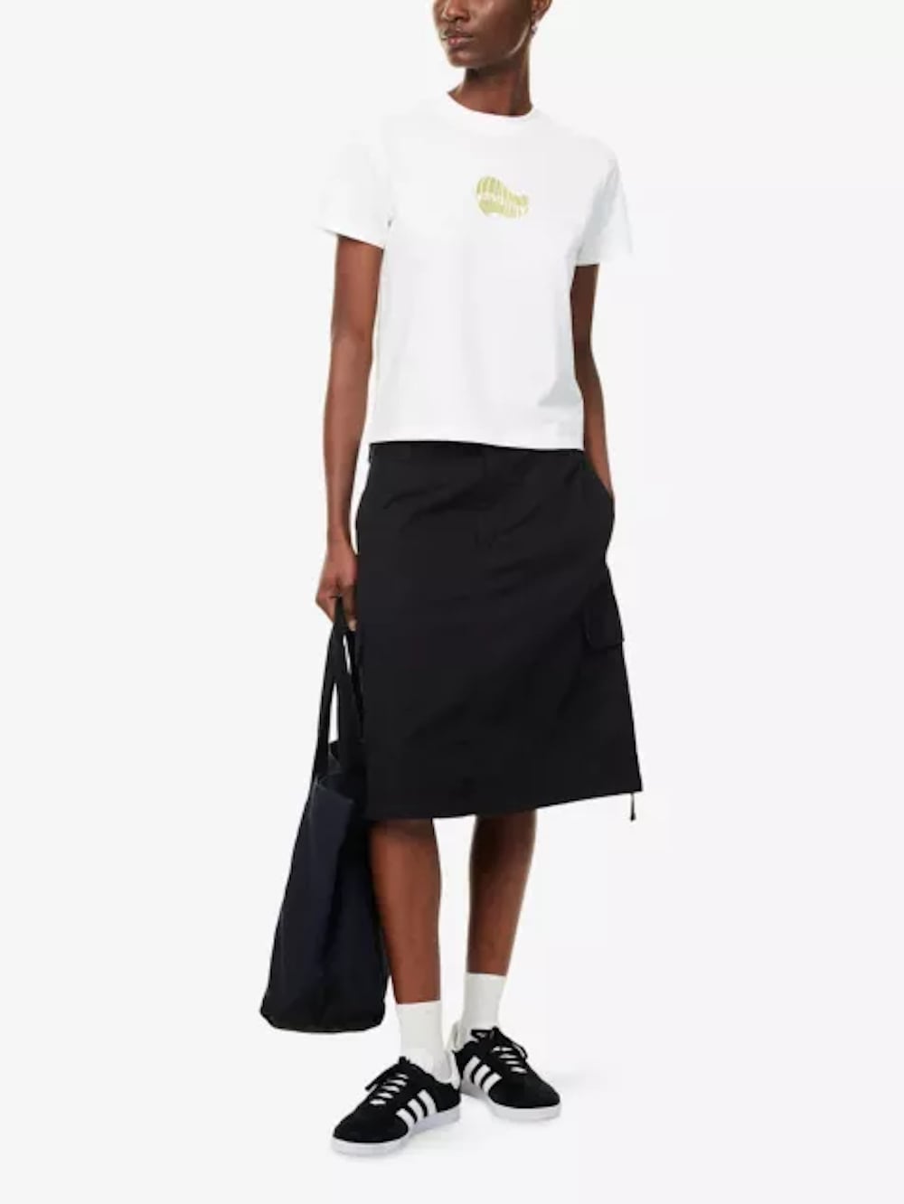 Η φούστα κοντή στο γόνατο επιστρέφει όχι ως νοσταλγία, αλλά ως εργαλείο layering. Ένα σχέδιο από τη Carhartt WIP φοριέται με πλεκτά, παλτό και μπότες. Δεν είναι εικόνα. Είναι καθημερινότητα.