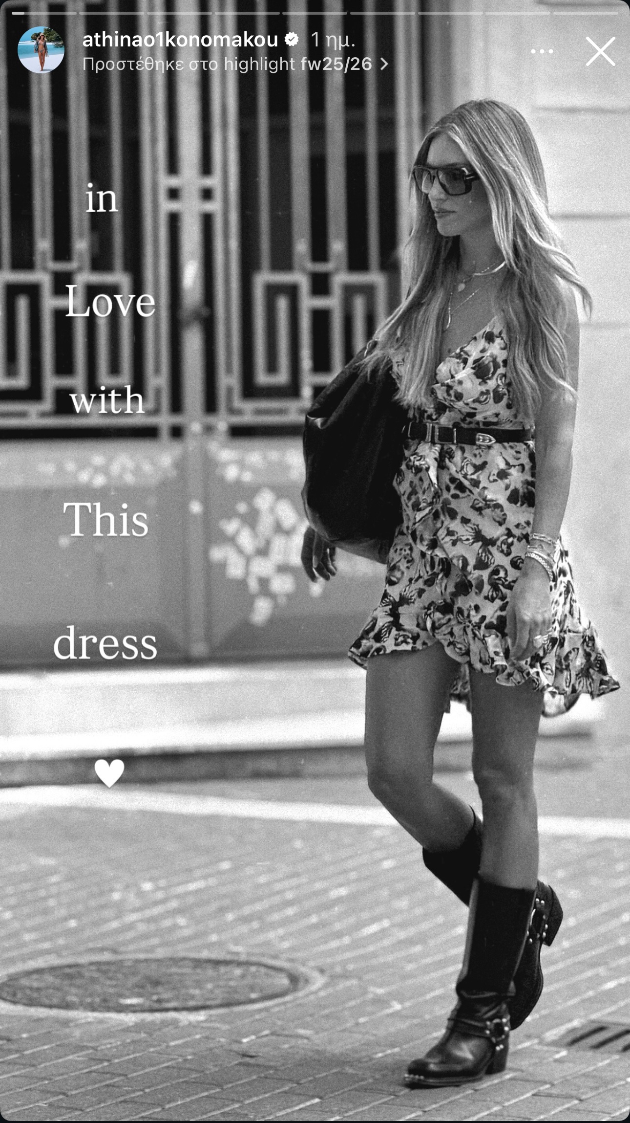 Στο πρώτο look, το μίνι φλοράλ φόρεμα αποπνέει μια αίσθηση καλοκαιρινής ανεμελιάς. Το μοτίβο του φέρνει στον νου κήπους γεμάτους χρώμα, ενώ η ζώνη στη μέση χαρίζει σχήμα στη σιλουέτα. Το styling, όμως, είναι εκείνο που δίνει την ανατροπή: οι μπότες με τις μεταλλικές λεπτομέριες μεταφέρουν το look σε πιο δυναμικά μονοπάτια, δημιουργώντας ένα bohemian-rock αποτέλεσμα. Το girly στοιχείο συναντά το edgy, και το φόρεμα αποκτά μια προσωπικότητα που αλλάζει ανάλογα με τα αξεσουάρ.