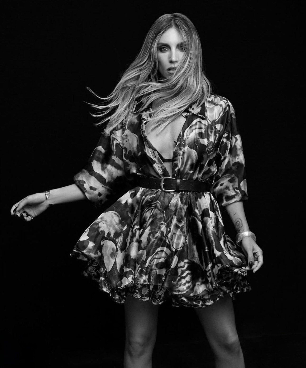 Με τρία διαφορετικά outfits, αποκαλύπτει τις πολλαπλές πλευρές του χαρακτήρα της: ένα φλοράλ φόρεμα με rock διάθεση, ένα πολυεπίπεδο σύνολο σε animal print και ένα abstract balloon dress με καλλιτεχνική πινελιά.