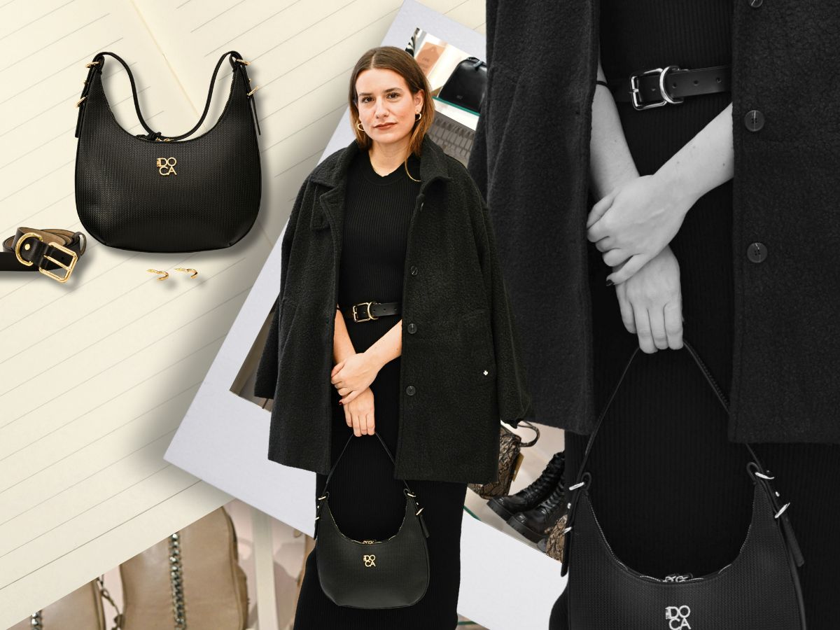 Επέλεξε ένα μαύρο πλεκτό φόρεμα, πρόσθεσε μια δερμάτινη ζώνη για να δώσει σχήμα και κράτησε μια δερμάτινη shoulder bag. Με τα χρυσά σκουλαρίκια της, το fleece jacket έγινε κομμάτι ενός 24hour look — ιδανικό από το γραφείο μέχρι ένα κοκτέιλ.