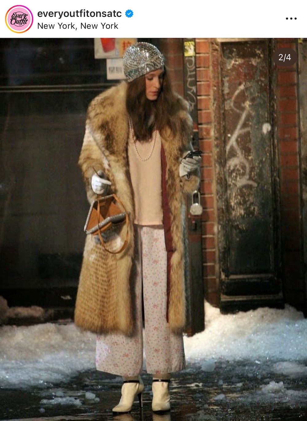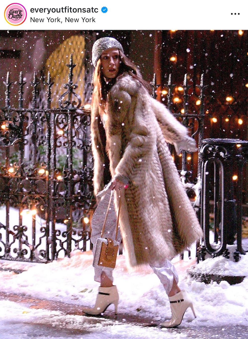 Η επιλογή του συγκεκριμένου head piece ήταν τόσο επιτυχημένη όσο και πρακτική. Συνδέθηκε με μια  πολύ συναισθηματική κινηματογραφική σκηνή  και με την προσπάθεια της Carrie να συμπαρασταθεί στη φίλη της που βρέθηκε σε μια στιγμή προσωπικής κρίσης και ανάγκης για υποστήριξη, όλα αυτά εναρμονισμένα με τις. Αμελές θερμοκρασίες  και τη festive ατμόσφαιρα. Μας θυμίζει πόσο πολύ η μόδα, πολλές φορές χωρίς να το συνειδητοποιούμε, συμπορεύεται με τις ζωές μας και μεταδίδει μηνύματα.