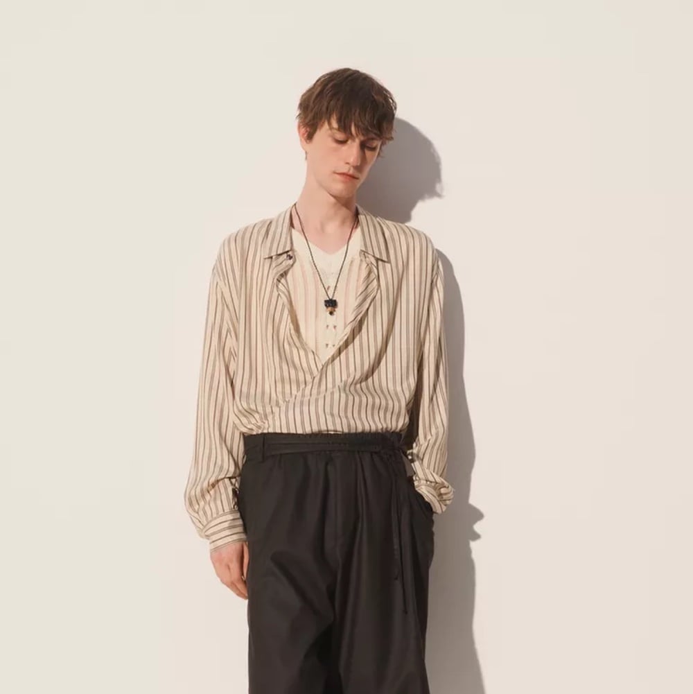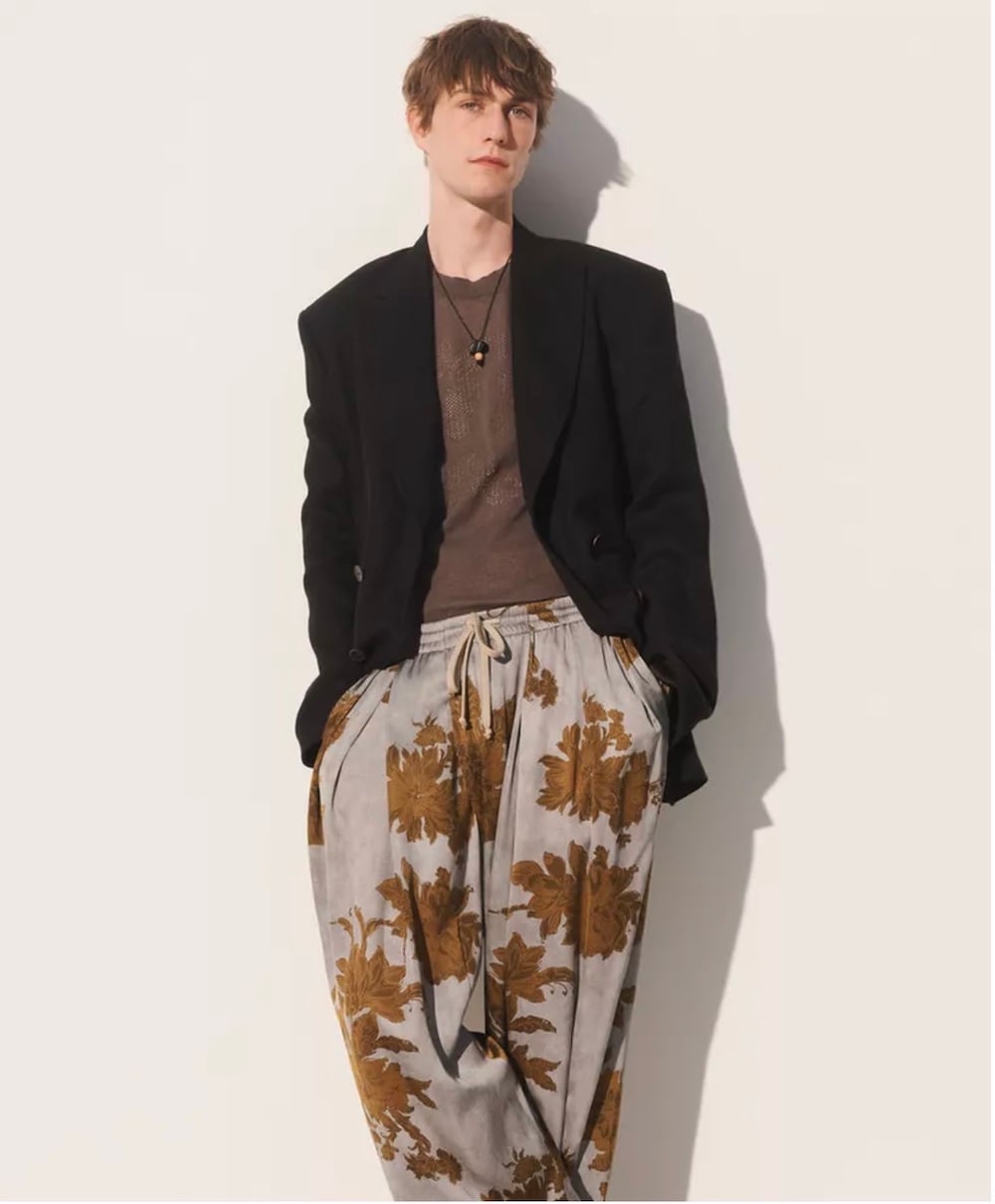 Το ίδιο συμβαίνει και με το παντελόνι. Ένα ανδρικό παντελόνι με πένσες, loose γραμμή και έντονο print, που δεν επιχειρεί να “ισορροπήσει” το σύνολο. Αντίθετα, το απομακρύνει ακόμη περισσότερο από μια εύκολη, έτοιμη εικόνα. Δεν είναι ένα σύνολο που αγοράζεται ως έχει. Είναι ένα σύνολο που προκύπτει μέσα από επιλογές.