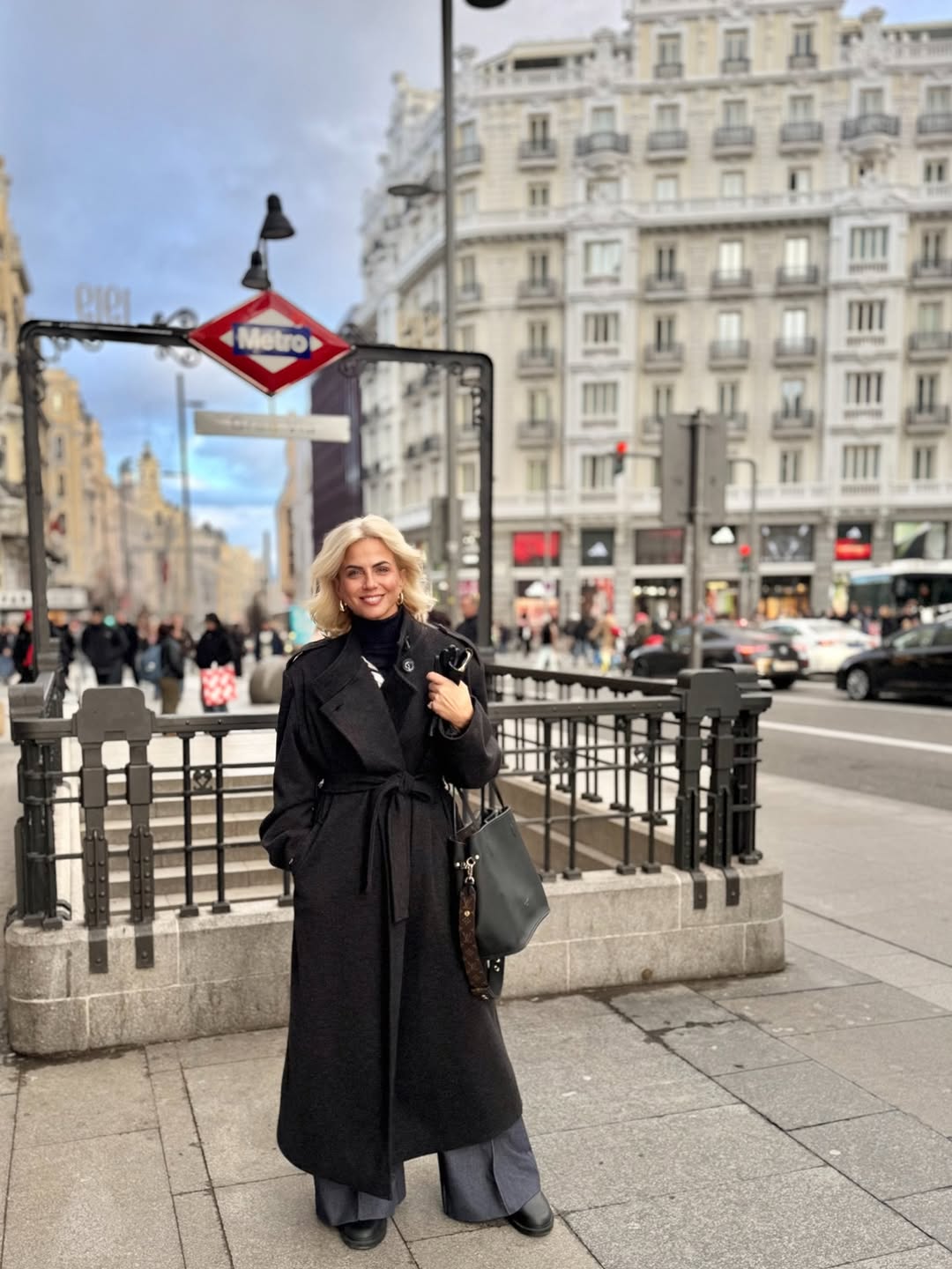 Σε πρωινές και απογευματινές βόλτες στο κέντρο της Μαδρίτης, επέλεξε ένα μακρύ σκούρο παλτό δεμένο στη μέση, το οποίο συνδύασε με ψηλόμεσο παντελόνι σε γκρι απόχρωση, μαύρο ζιβάγκο και μαύρα παπούτσια. Το σύνολο ολοκληρώθηκε με μαύρα δερμάτινα γάντια και μεγάλη Louis Vuitton tote τσάντα, δημιουργώντας ένα πρακτικό αλλά προσεγμένο look, ιδανικό για περπάτημα στην πόλη.