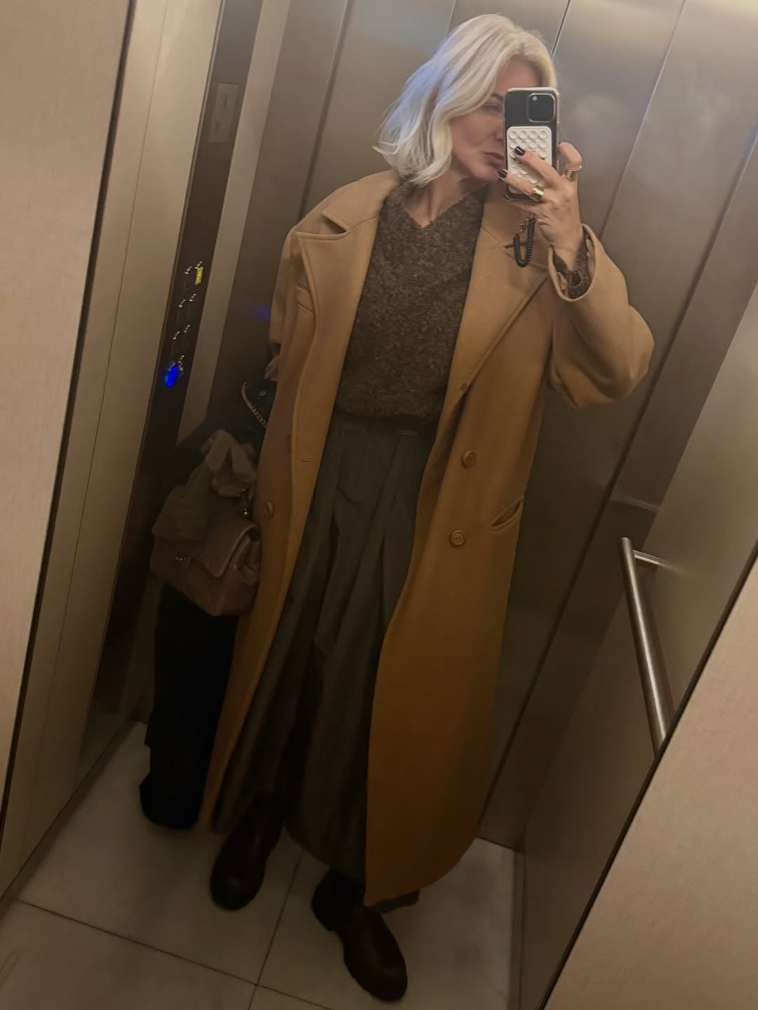 Σε άλλη εμφάνιση, υιοθέτησε πιο ζεστή χρωματική παλέτα, επιλέγοντας καμηλό παλτό, πλεκτό σε γήινους τόνους και midi φούστα, συνδυάζοντας άνεση και κομψότητα. Τα χαμηλά παπούτσια και η structured τσάντα Chanel κράτησαν το outfit σε χαλαρό ύφος, κατάλληλο για καθημερινές μετακινήσεις.