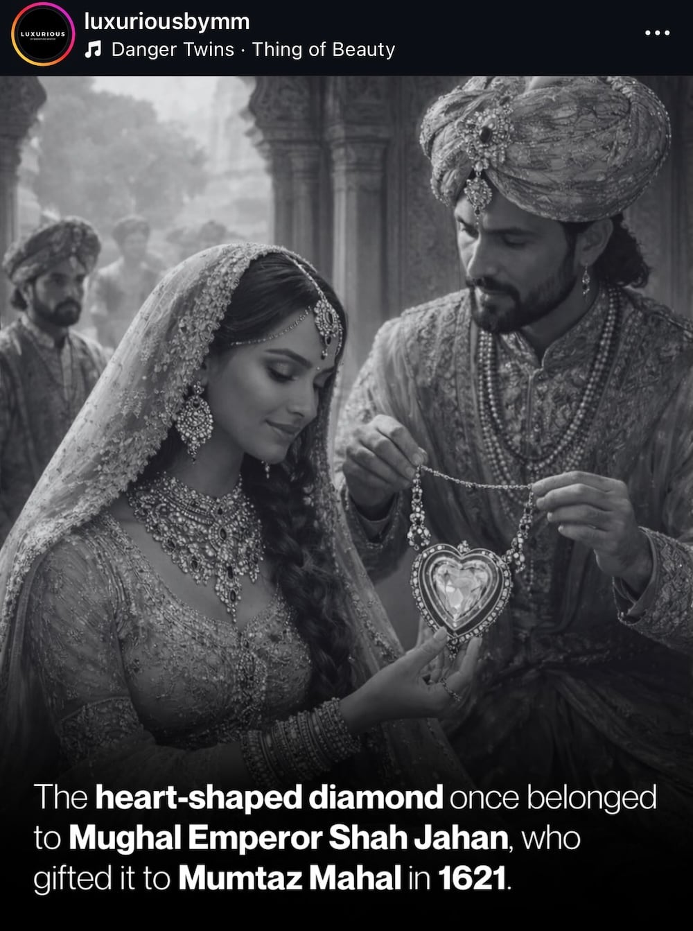Το μενταγιόν Taj Mahal είναι ένα επίπεδο, καρδιόσχημο διαμάντι με χαραγμένες περσικές επιγραφές, που φέρεται να δημιουργήθηκε τον 17ο αιώνα στην αυλή του Μουγκάλ αυτοκράτορα Shah Jahan. Ο ίδιος το χάρισε στη σύζυγό του Mumtaz Mahal, σαν ένδειξη αιώνιας αγάπης, την ίδια γυναίκα για την οποία αργότερα έχτισε το μαυσωλείο Taj Mahal. Ένα κόσμημα που γεννήθηκε από τον έρωτα και θρήνο ενός αυτοκράτορα, επρόκειτο να βρει νέα ζωή, αιώνες μετά, στον λαιμό μιας γυναίκας που έγινε η επιτομή του χολιγουντιανού πάθους.