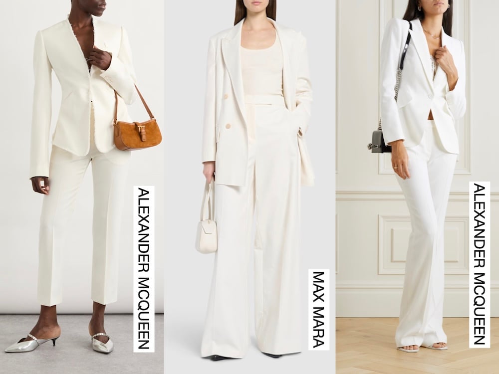 Από την Μπιάνκα Τζάγκερ έως τη Χίλαρι Κλίντον, το λευκό κοστούμι έχει φορεθεί από γυναίκες που άλλαξαν την ιστορία της μόδας και της πολιτικής. Στις σύγχρονες συλλογές, το λευκό tailoring εξελίσσεται μέσω ποικίλων σχεδιαστικών προσεγγίσεων, προσφέροντας από μίνιμαλ γραμμές έως πιο θεατρικές και θηλυκές αναγνώσεις, παραμένοντας σύμβολο κομψότητας και δύναμης.