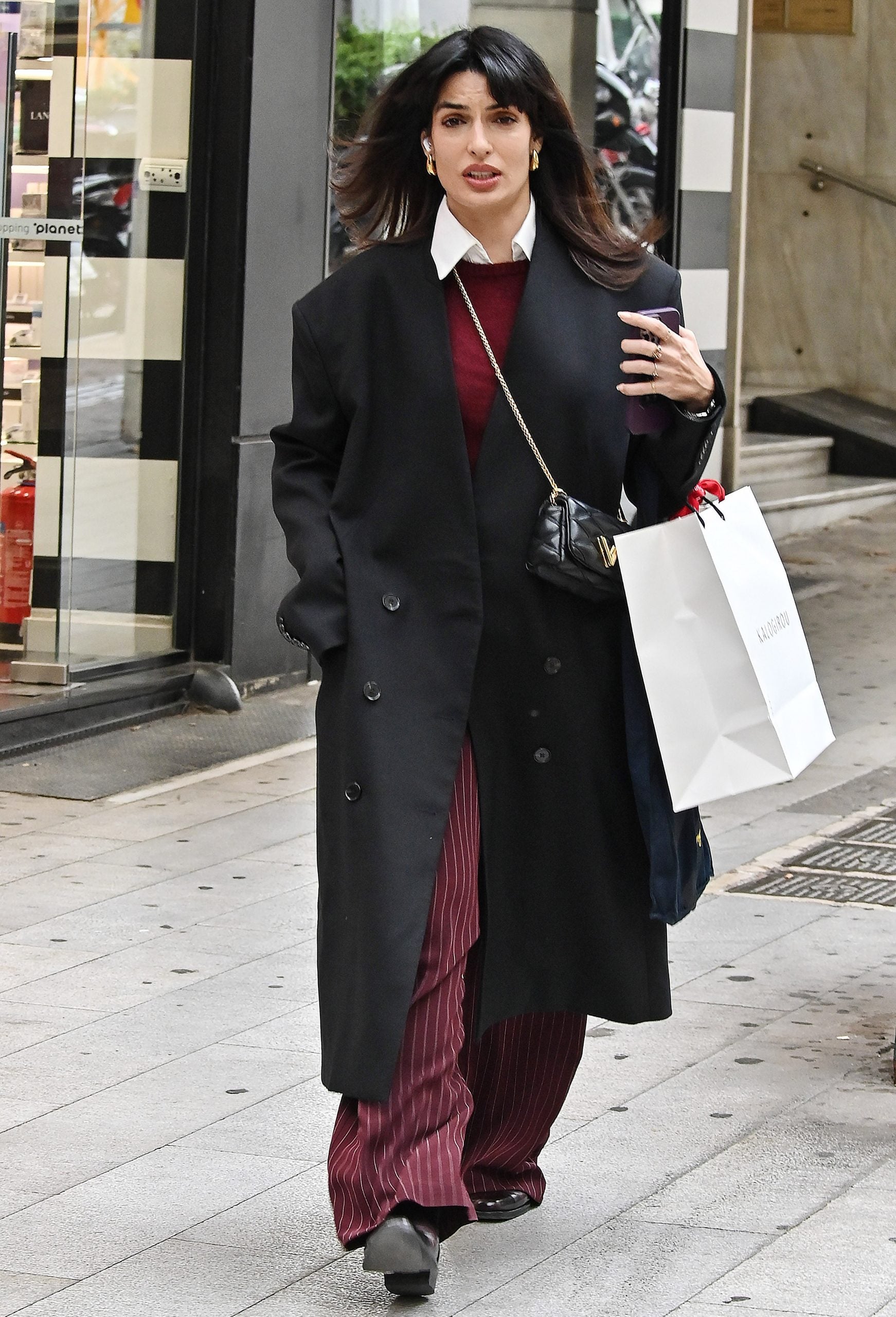 Η ηθοποιός κινήθηκε σε μια χειμερινή παλέτα με κόκκινες/μπορντό αποχρώσεις, που έδωσαν χαρακτήρα στην εμφάνιση, ενώ «έδεσε» το σύνολο με μια μαύρη καπαρντίνα. Κάτω από το πανωφόρι, η λευκή πινελιά από το πουκάμισο ισορρόπησε ιδανικά το πιο βαθύ χρώμα του outfit.