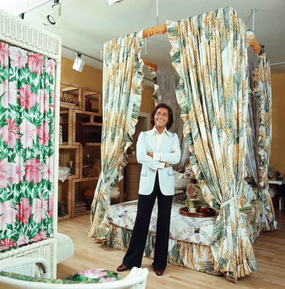 Μπροστά από ένα κρεβάτι σχδιασμένο από τον ίδιο, σε παλιό αμερικανικό στιλ, στο ατελιέ του, το 1972.