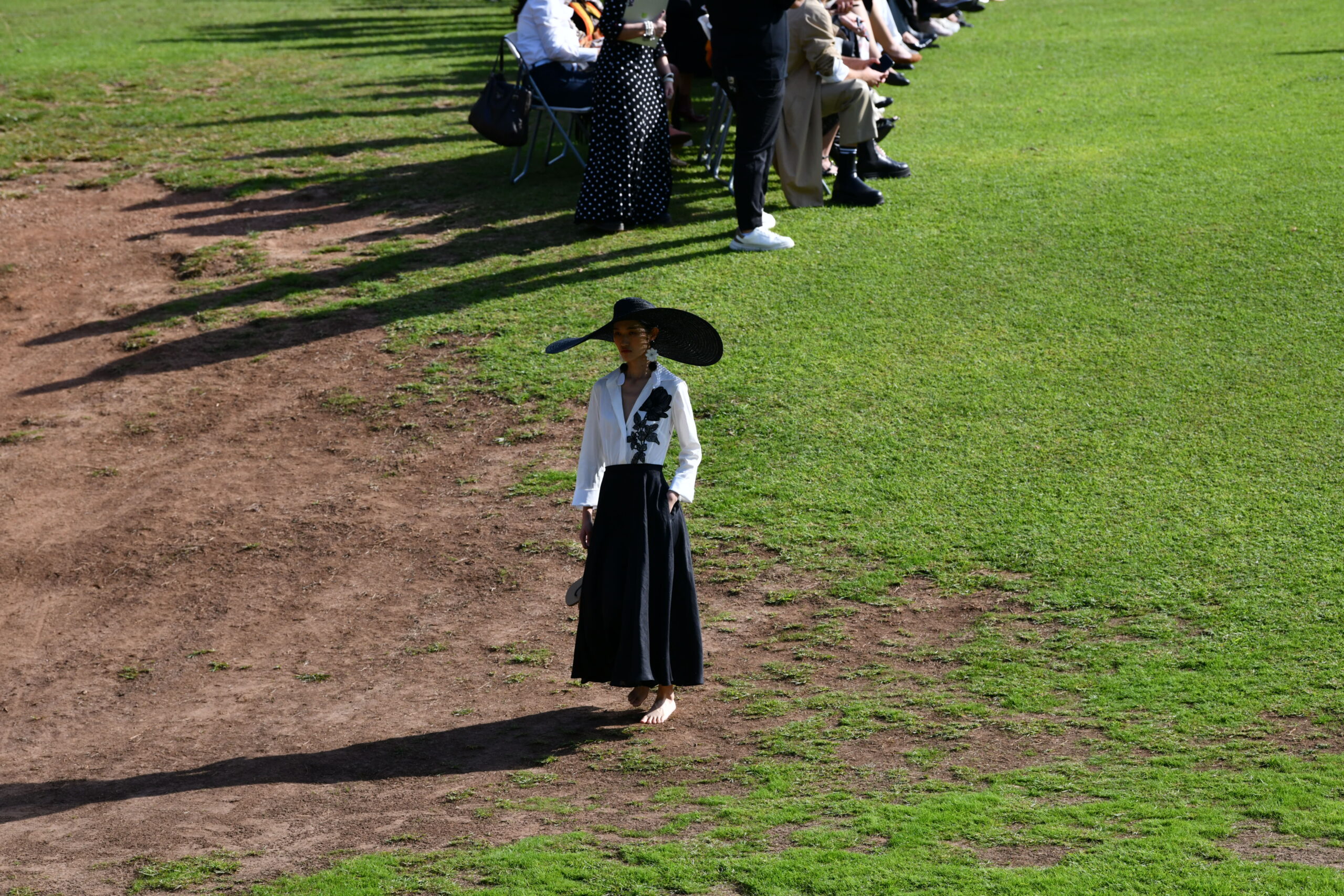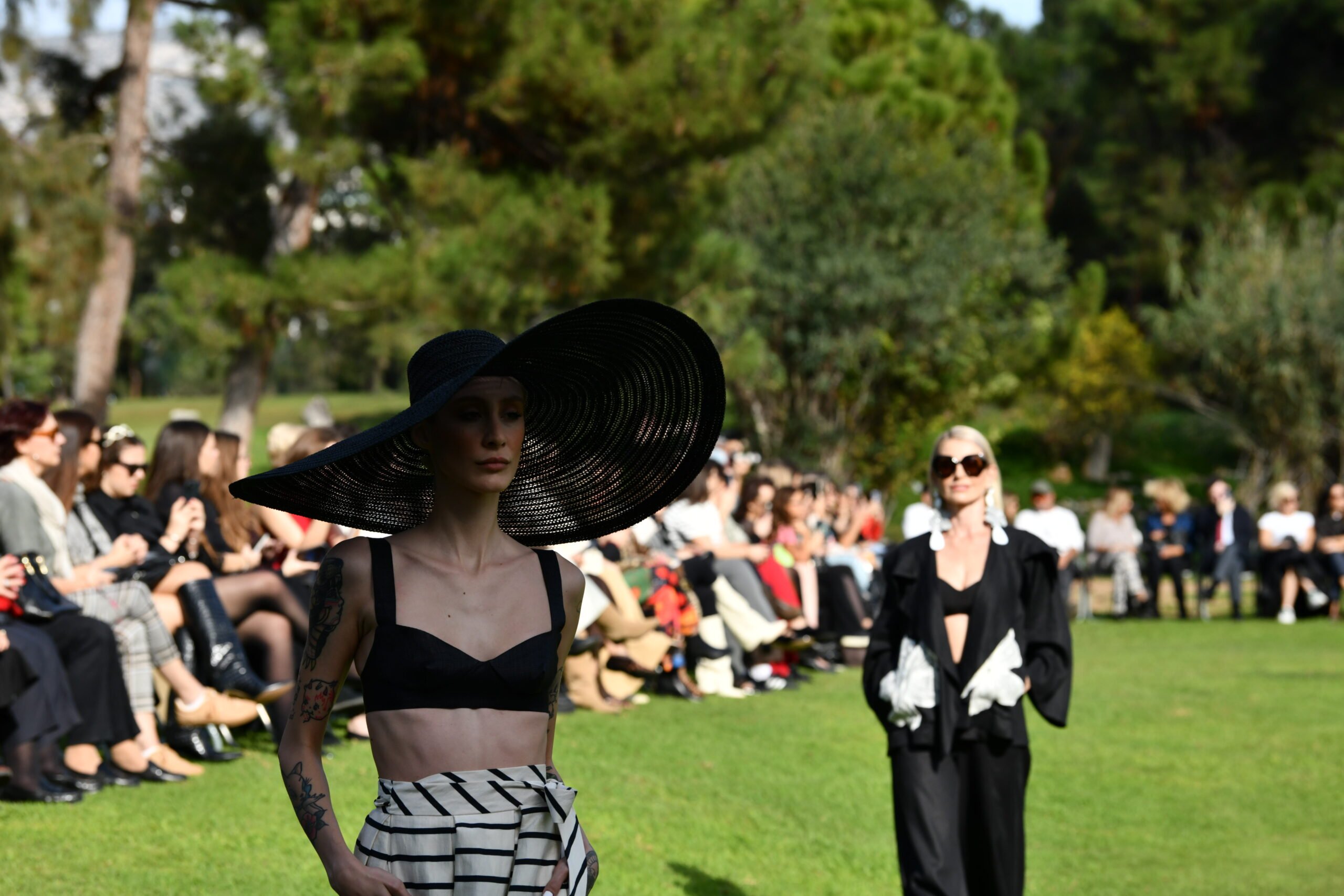 Το catwalk άνοιξε με μια σειρά από εντυπωσιακά black & white σύνολα, όπου οι πουά σιλουέτες, τα σκηνοθετημένα μαύρα φορέματα και τα statement καπέλα έθεσαν τον τόνο μιας κομψής, σχεδόν κινηματογραφικής έναρξης. Η αυστηρή μονοχρωμία έδινε την αίσθηση ενός παλιού, ασπρόμαυρου καλοκαιρινού φιλμ, δημιουργώντας δυναμική αντίθεση με όσα θα ακολουθούσαν.