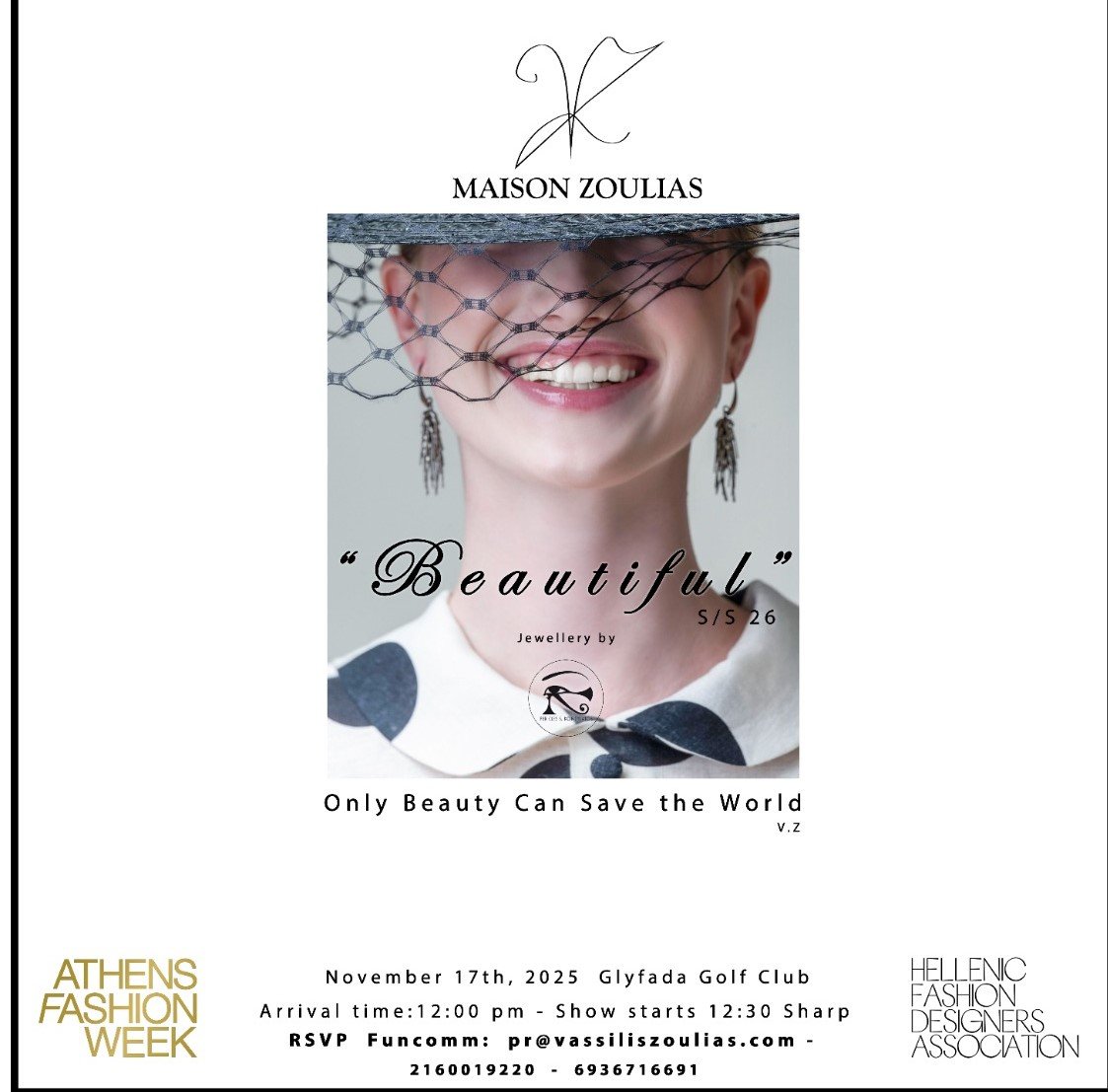 Στο πλαίσιο της Athens Fashion Week, λίγες μέρες πριν λάβαμε την πρόσκληση για την επίδειξη «Beautiful», τη Pret-A-Porter συλλογή Άνοιξη–Καλοκαίρι 2026 του Maison Zoulias. Η πρόσκληση ήταν ήδη μια πρώτη γεύση του ονείρου: μια ρετρό φωτογραφία με ένα χαμογελαστό κορίτσι, ντυμένο με ένα floral σύνολο και ψάθινο καπέλο με βέλο. Κάτω από την εικόνα, το moto της συλλογής: «Only the beauty can save the world!» — μια φράση που συνοψίζει απόλυτα τη φιλοσοφία του σχεδιαστή.