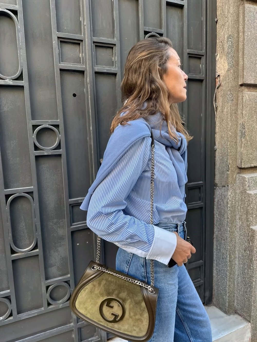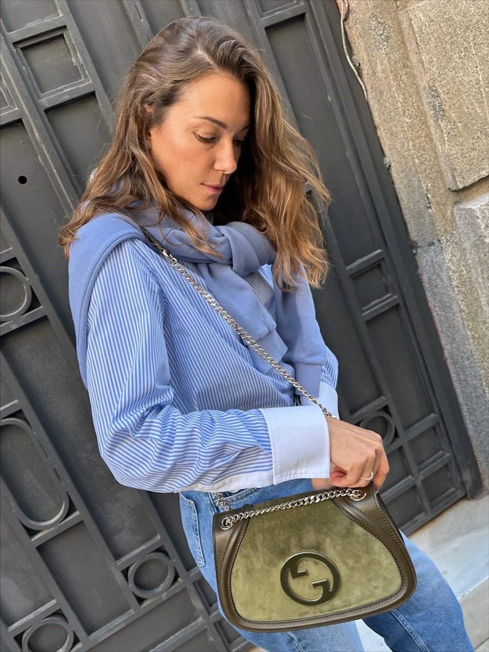 - Συνδυάζει την τσάντα με ριγέ πουκάμισο, τζιν και φούτερ από το brand της, προσδίδοντας ανεπιτήδευτη κομψότητα.