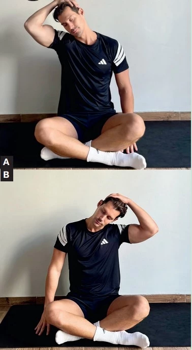 A. Βρίσκεσαι σε καθιστή θέση οκλαδόν. Τοποθετείς το δεξί χέρι στο αριστερό αφτί και τραβάς το κεφάλι προς τον δεξιό ώμο με ήπιο τρόπο, κάνοντας διάταση στην αριστερή πλευρά του αυχένα και του λαιμού.