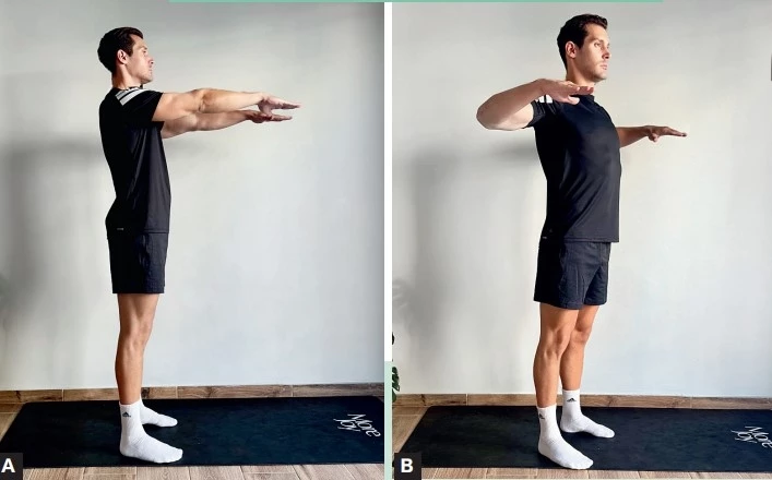 A. Βρίσκεσαι σε όρθια θέση, με τα πόδια παράλληλα και τα χέρια τεντωμένα μπροστά, στο ύψος του στήθους.