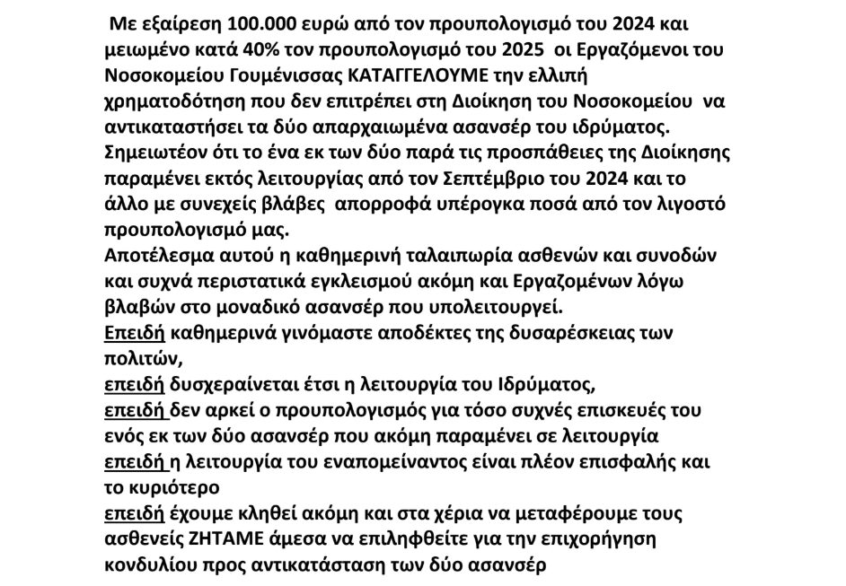 Με ένα ασανσέρ, και αυτό να υπολειτουργεί, παραμένει το νοσοκομείο της Γουμένισσας στο Κιλκίς, όπως καταγγέλλει το Σωματείο Εργαζομένων του Γενικού Νοσοκομείου – Κέντρου Υγείας της περιοχής.