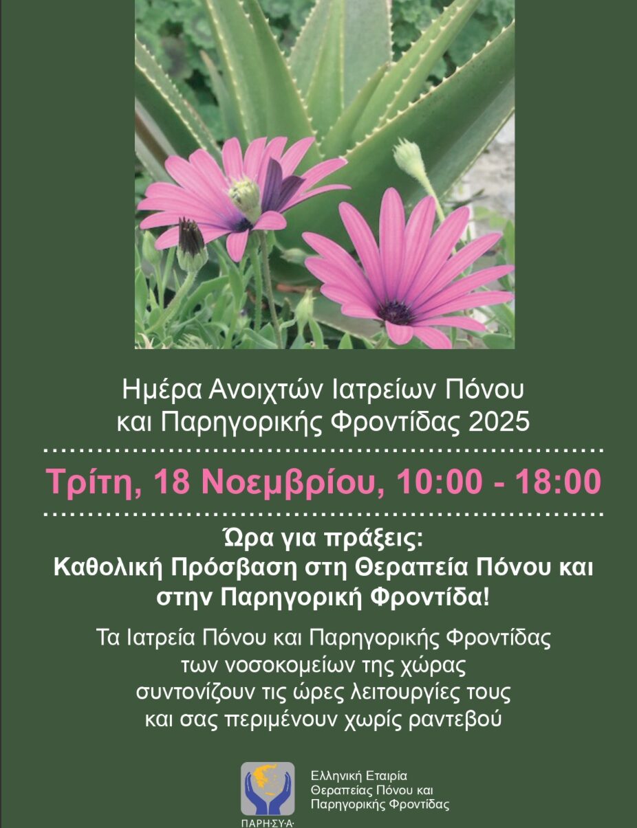 Το Ιατρείο Πόνου και Παρηγορικής Φροντίδας του Νοσοκομείου Παπαγεωργίου θα δέχεται ασθενείς χωρίς ραντεβού την Τρίτη 18 Νοεμβρίου 2025, από τις 10:00 έως τις 18:00, στο πλαίσιο της Ημέρας Ανοιχτών Ιατρείων Πόνου και Παρηγορικής Φροντίδας.