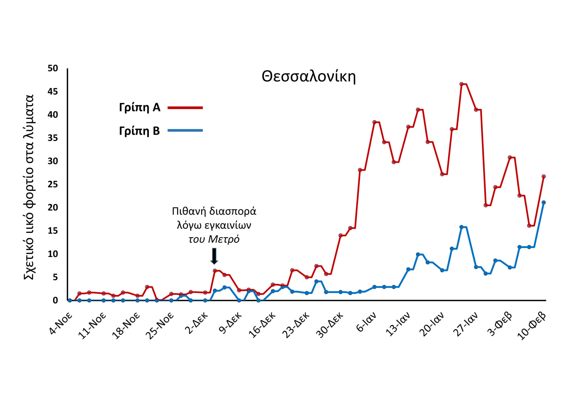 Τα στοιχεία από τις μετρήσεις της Ομάδας Επιδημιολογίας Λυμάτων του ΑΠΘ στη Θεσσαλονίκη δείχνουν ότι οι ιοί της γρίπης Α, γρίπης Β και του κορονοϊού ανιχνεύονται σε συνήθη επίπεδα. Από την αρχή του Φεβρουαρίου, παρατηρείται μείωση 43% στο ιικό φορτίο του SARS-CoV-2, ενώ η γρίπη Α σημειώνει πτώση 19% και η γρίπη Β αύξηση 39%.