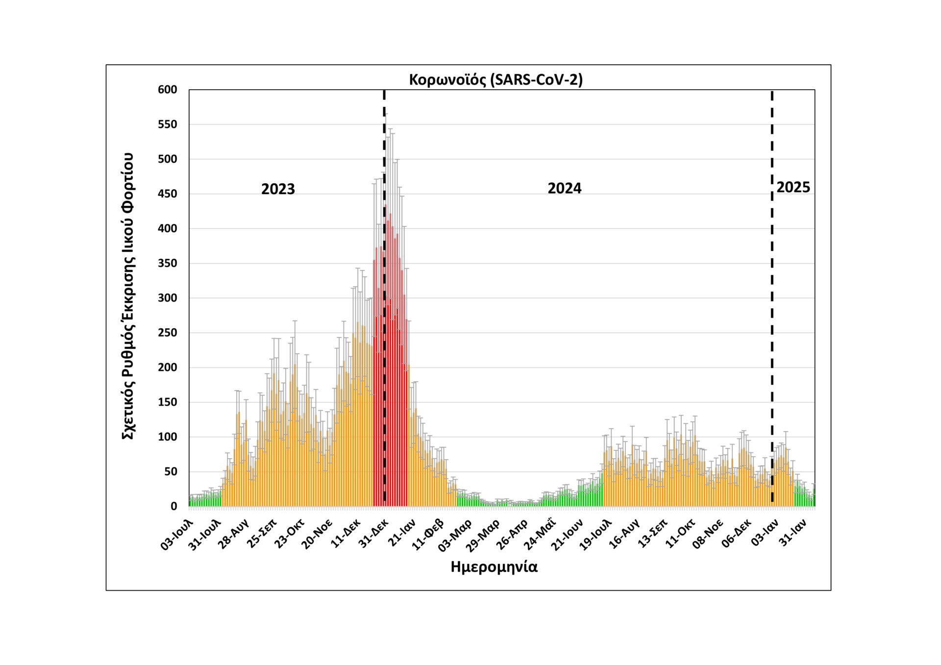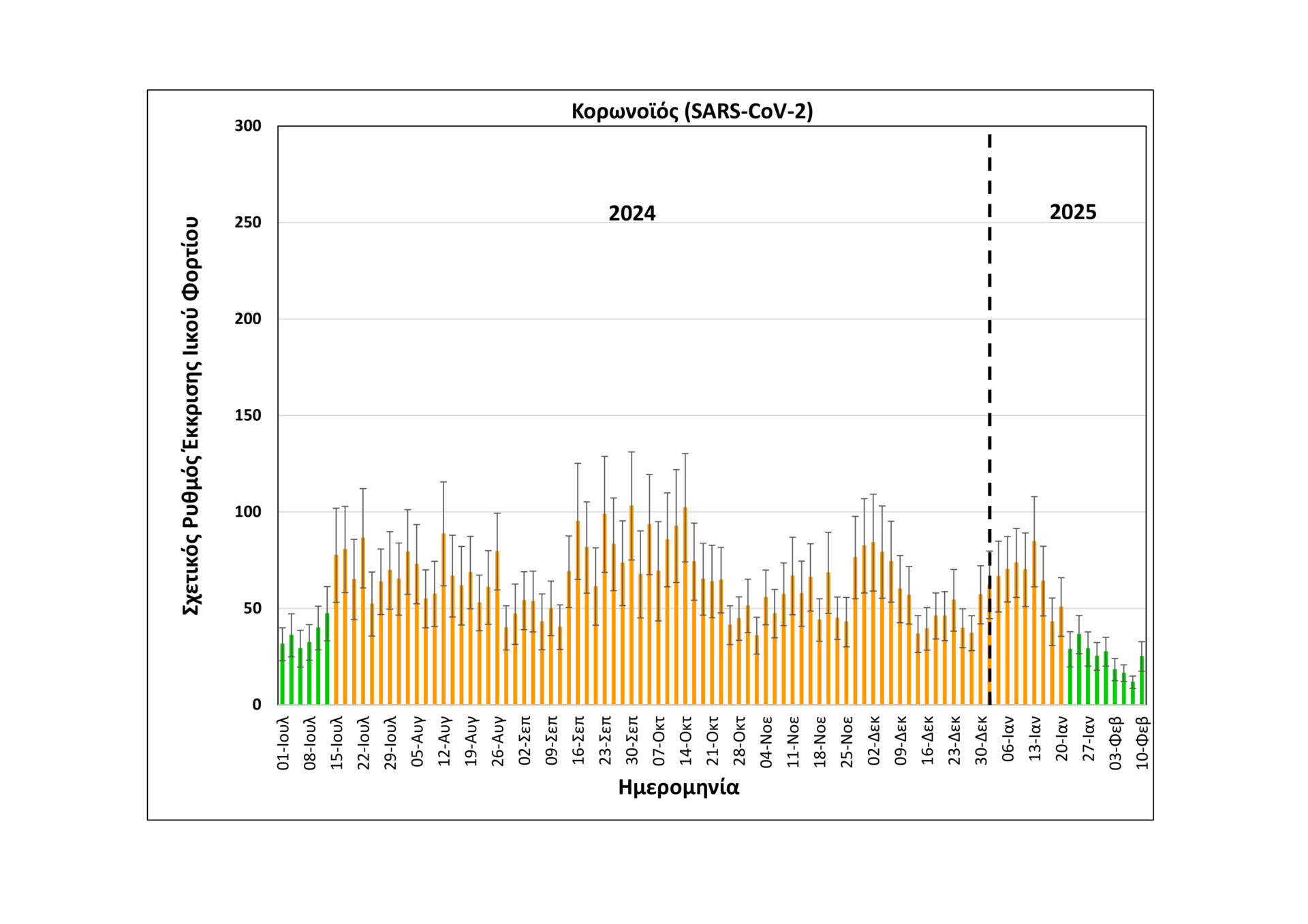 Η μέση εβδομαδιαία τιμή του φορτίου του SARS-CoV-2 την εβδομάδα 3/2/025-9/2/2025 (ISO WEEK 6) σε σχέση με την αμέσως προηγούμενη (27/1/2025-2/2/2025 -ISO WEEK 5) μειώθηκε κατά 43%. Συστηματική αποκλιμάκωση των τιμών του ιικού φορτίου παρατηρείται μετά το τέλος Ιανουαρίου 2025.