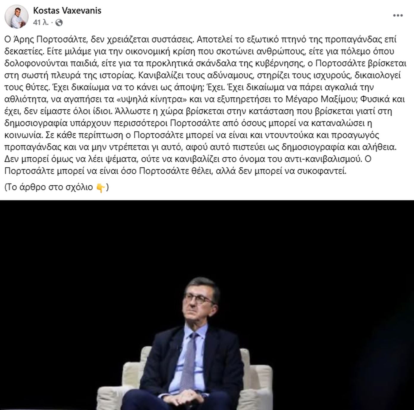 «Ο Άρης Πορτοσάλτε δεν χρειάζεται συστάσεις. Αποτελεί το εξωτικό πτηνό της προπαγάνδας επί δεκαετίες. Είτε μιλάμε για την οικονομική κρίση που σκοτώνει ανθρώπους, είτε για πόλεμο όπου δολοφονούνται παιδιά, είτε για τα προκλητικά σκάνδαλα της κυβέρνησης, ο Πορτοσάλτε βρίσκεται στη σωστή πλευρά της ιστορίας. Κανιβαλίζει τους αδύναμους, στηρίζει τους ισχυρούς, δικαιολογεί τους θύτες», γράφει αρχικά ο Κώστας Βαξεβάνης στον λογαριασμό του στο Facebook.