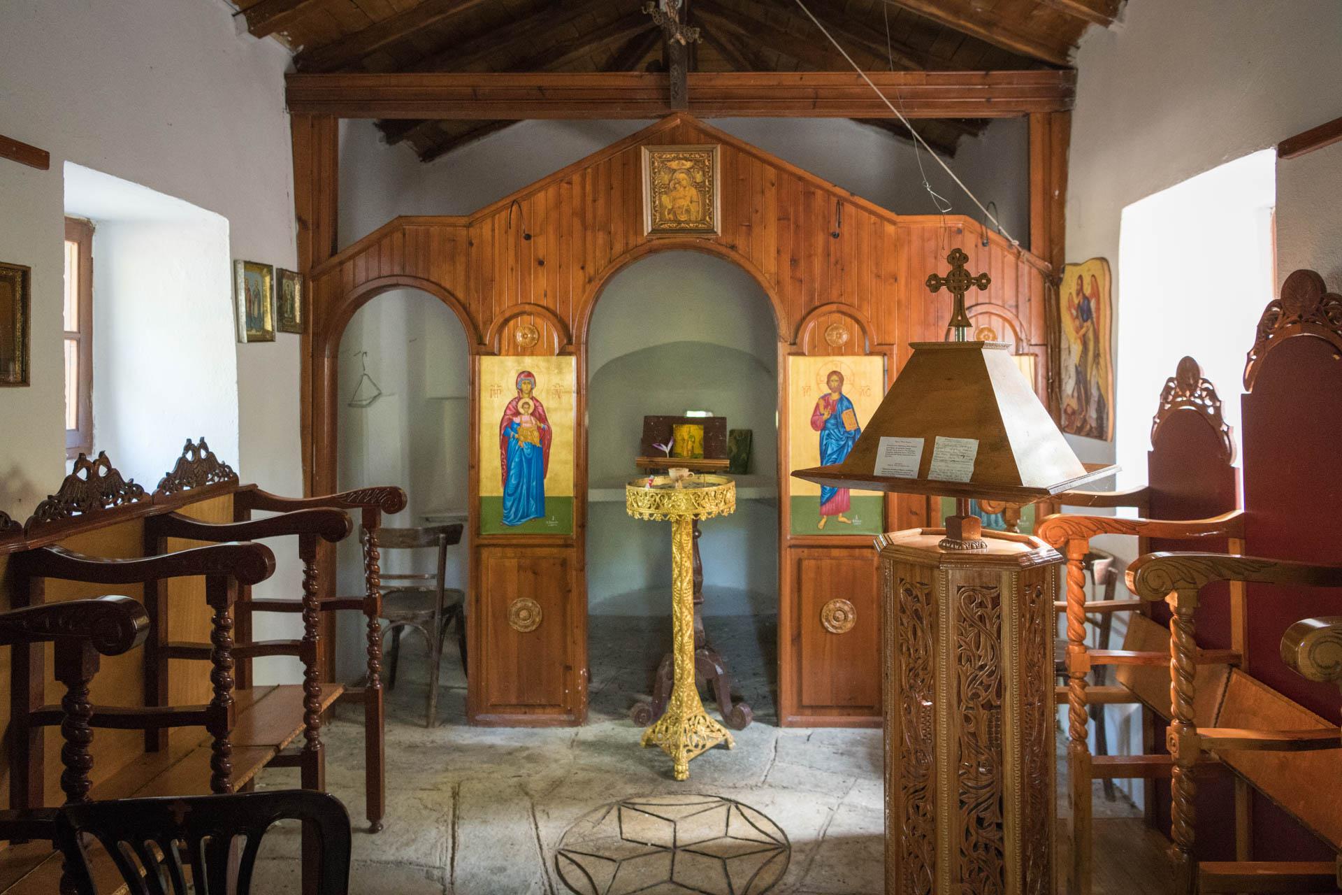 Από το όμορφα φιλοτεχνημένο κτίσμα ξεχωρίζουν οι αγιογραφίες και οι εικόνες της Παναγίας, με κυριότερες την «Παναγία την Οδηγήτρια», και την «Παναγία με τις μαχαιριές», που ονομάστηκε έτσι από τα σημάδια τα οποία άφησαν πάνω της τα ξίφη των Τούρκων όταν κατέστρεφαν το χωριό.
