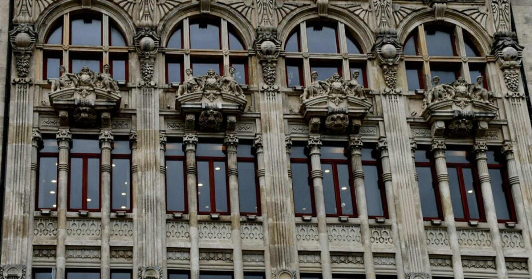 Στον πρώτο εξώστη υπάρχουν δύο αγάλματα από ερωτιδείς, ενώ στον τελευταίο όροφο βρίσκονται δύο γλυπτές κεφαλές Ερμή, προστάτη του Εμπορίου, που απεικονίζεται με πέτασο και κηρύκειο. Ο Βασίλειος Μ. Κουρεμένος (1875-1957) με καταγωγή από τους Βουλιαράτες της Βορείου Ηπείρου ήταν Έλληνας αρχιτέκτονας και καθηγητής στο Εθνικό Μετσόβιο Πολυτεχνείο. Εργάστηκε στην Κωνσταντινούπολη από το 1910 έως το 1915, με σημαντικότερο έργο του, το υποκατάστημα της Τράπεζας Αθηνών. Το όνομα του ήρθε στην επικαιρότητα το 2007, όταν το Υπουργείο Πολιτισμού αποφάσισε τον αποχαρακτηρισμό και την κατεδάφιση ενός έργου του, της «Μικρής Πολυκατοικίας» στην οδό Διονυσίου Αρεοπαγίτου 17 στην Αθήνα, για να μην εμποδίζει τη θέα της Ακρόπολης από το Νέο Μουσείο. Η απόφαση προκάλεσε αντιδράσεις που είχαν ως αποτέλεσμα τη σωτηρία του μοναδικού αυτού έργου τέχνης.