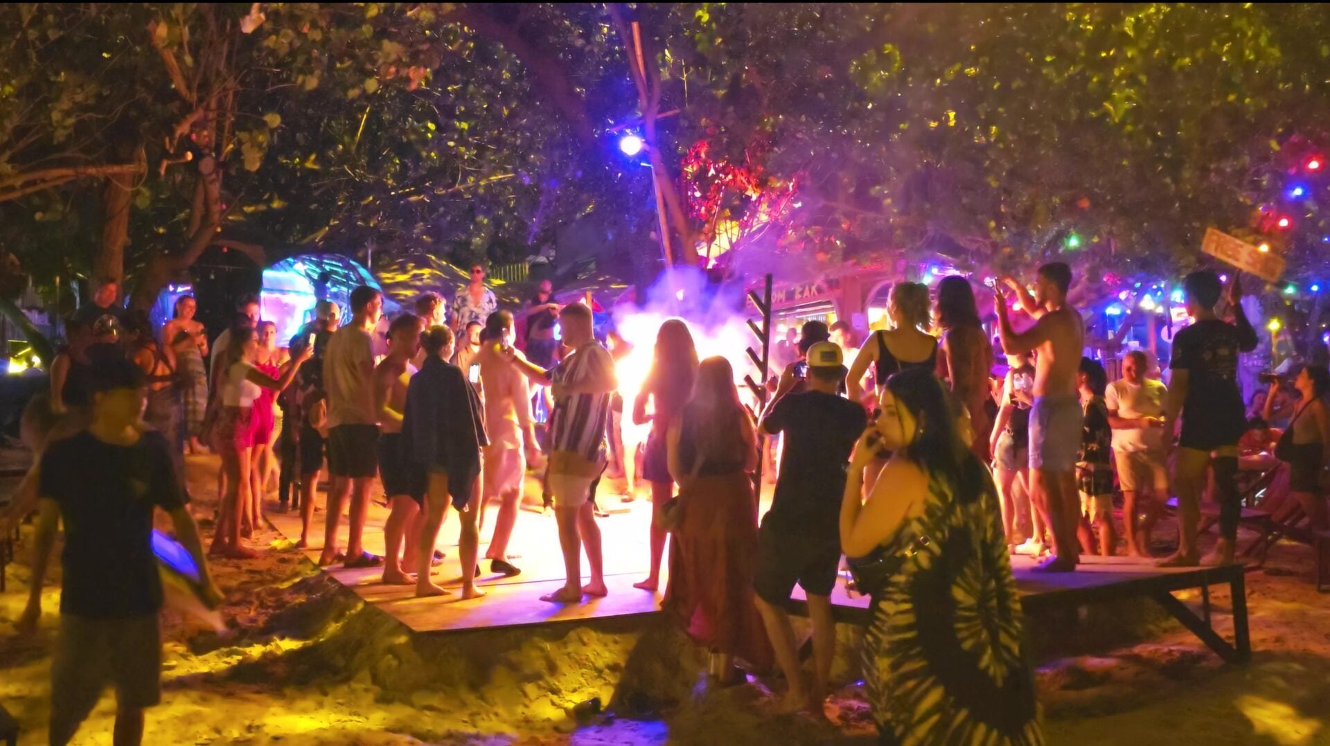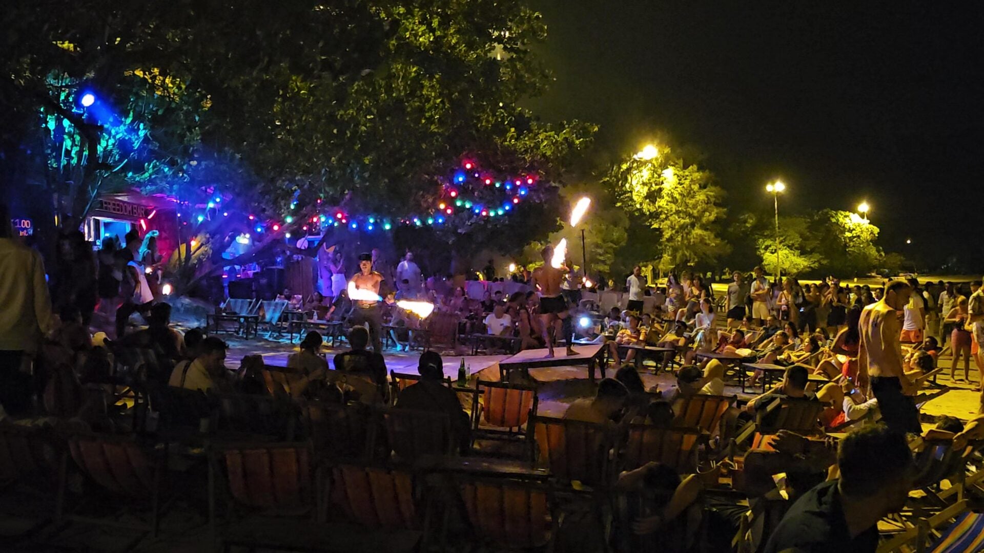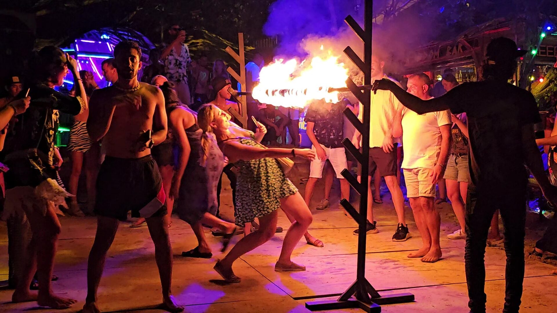 Στην άκρη της θάλασσας, τα club βγάζουν τους fire dancers. Κινούν φλεγόμενες ράβδους με ακρίβεια και έλεγχο που δεν αφήνει περιθώριο για λάθος. Δεν είναι παιχνίδι, είναι τεχνική.