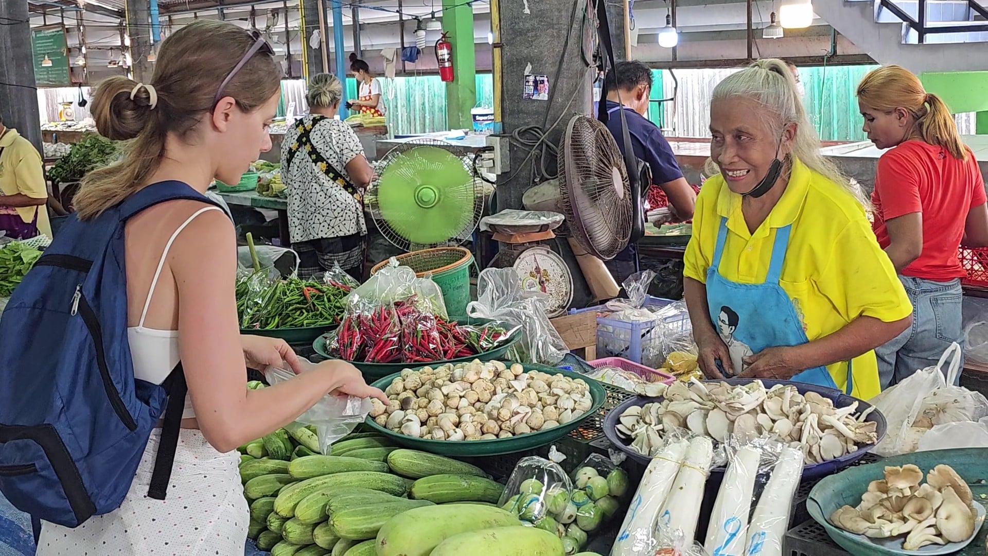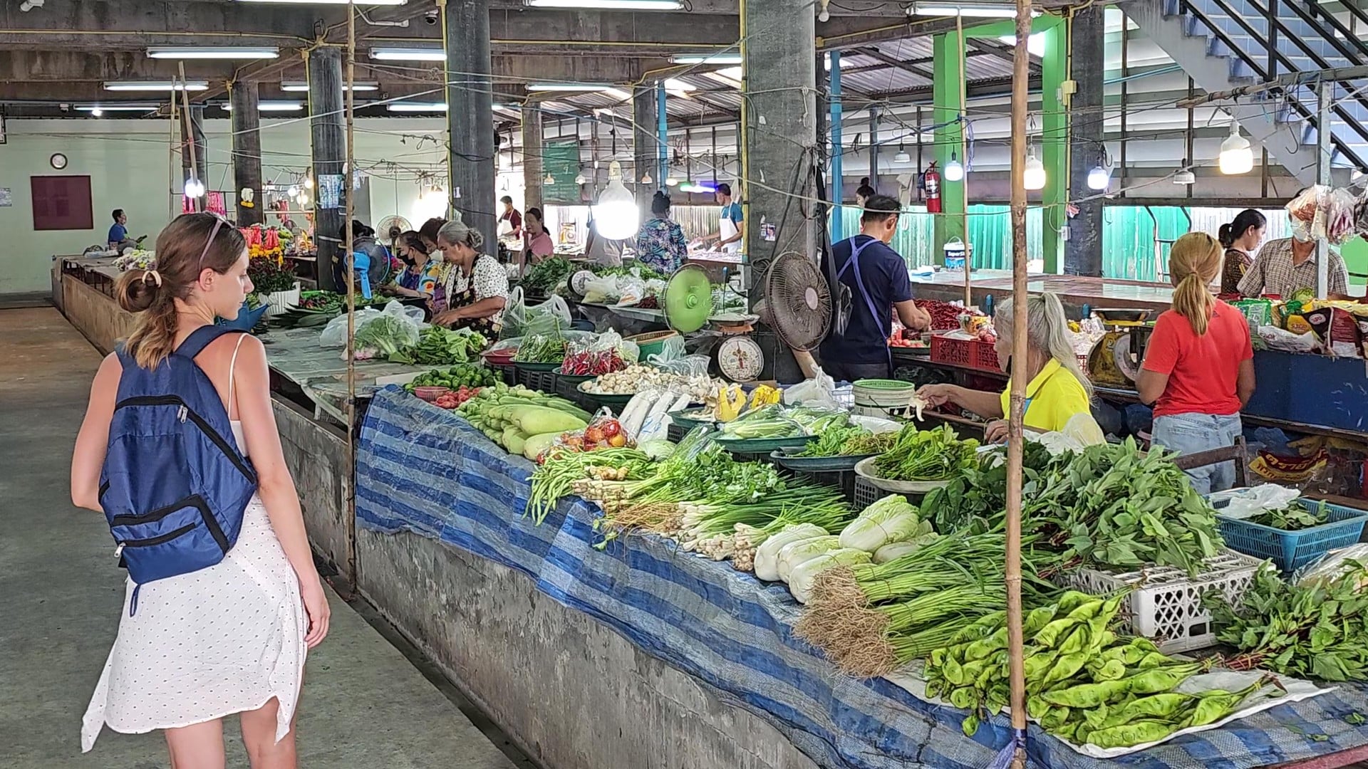Βρήκαμε μια κοντινή λαϊκή αγορά, γεμάτη με κάθε είδους λαχανικών. Εδώ είναι η χαρά του χορτοφάγου. Η Ταϊλάνδη έχει εξαιρετικές αγορές με τεράστια ποικιλία σε φρέσκα προϊόντα με έντονα αρώματα. Δύο μας έκαναν ιδιαίτερη εντύπωση: οι καυτερές πιπεριές —που θέλουν πολύ προσοχή— και τα μανιτάρια, με πλούσια γεύση και υφή.