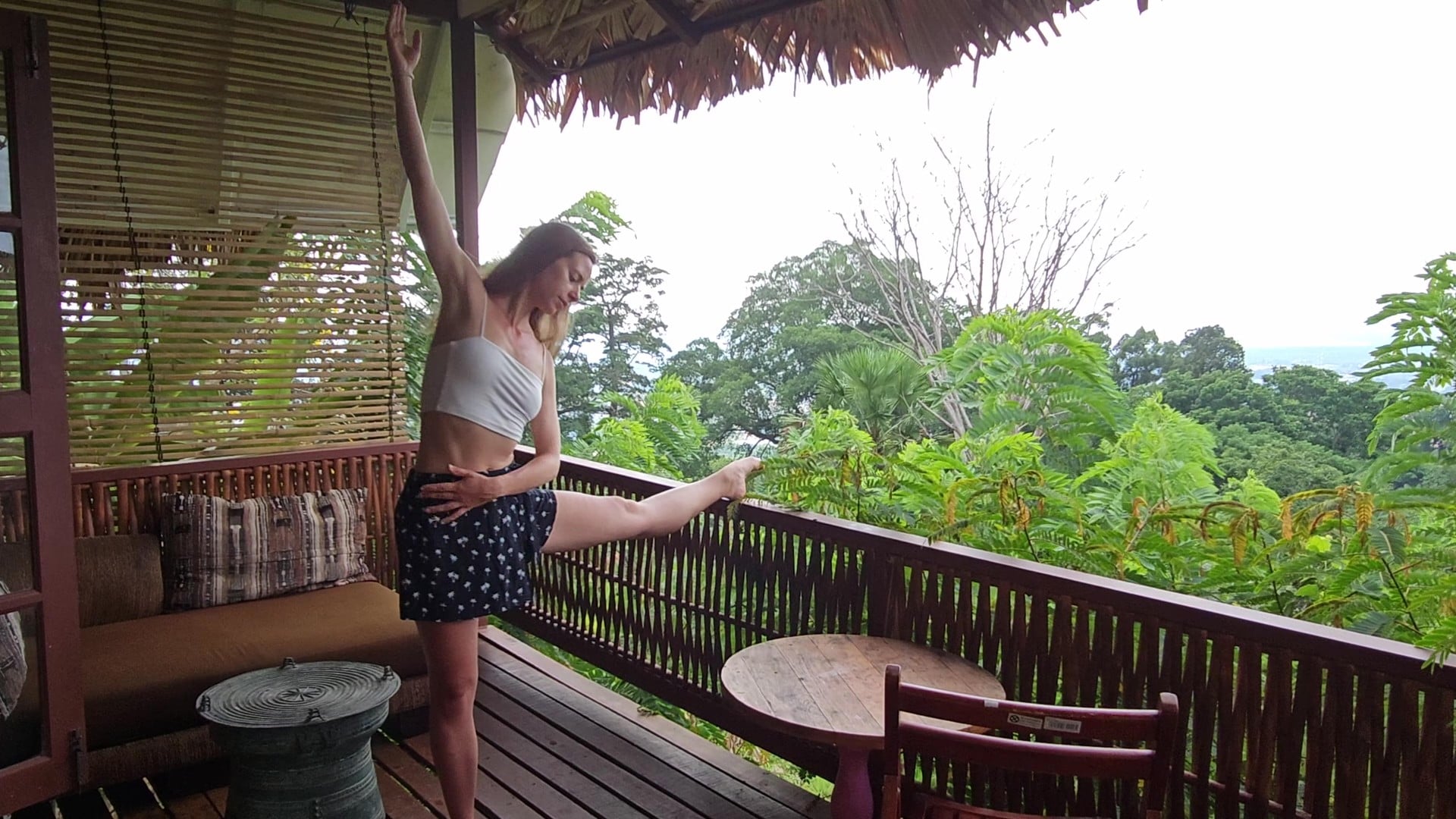 Μπορείς να επιλέξεις ασκήσεις από την yoga ή από όπου αλλού θέλεις. Εμείς κάνουμε ένα δικό μας συνδυασμό ασκήσεων που ξυπνάει όλο το σώμα σταδιακά. Ξεκινάμε με ασκήσεις αναπνοής, μετά πάμε χέρια, πλάτη, ώμοι, αυχένας, σπονδυλική μέση, πόδια. Έτσι περνάμε για λίγο από όλα τα σημεία του σώματος. Εδώ στις ξύλινες καλύβες μπορούσες να ξαπλώσεις και στο πάτωμα για ασκήσεις εδάφους. Το ταξιδιωτικό μας πρόγραμμα ασκήσεων είναι περίπου μισή ώρα.