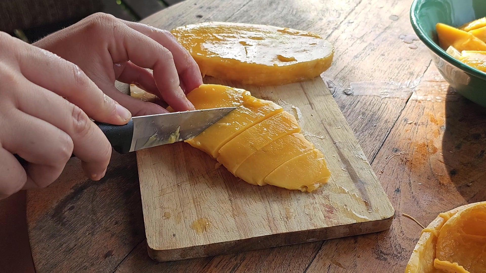 Μάθαμε τις ποικιλίες του, τις περιοχές που καλλιεργείται, ακόμη και τα μικρά αγροκτήματα που το παράγουν βιολογικά. Το κόβαμε σε λεπτές φέτες και από πάνω βάζαμε κρέμα καρύδας — κάτι ανάμεσα σε γιαούρτι και γάλα, ελαφρύ και δροσερό.