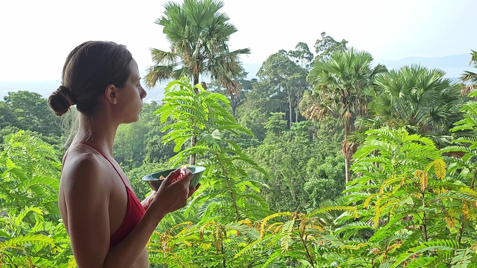 Όρθιοι απέναντι σε αυτό το πράσινο τοπίο απολαμβάναμε την φρουτοσαλάτα μας. Με τον αέρα να περνάει μέσα από τα δέντρα, τα πουλιά να κελαηδούν, η μέρα ξεκινούσε όμορφα, χωρίς βιασύνη. Μόνο με το σώμα, τη γεύση και την αίσθηση ότι βρίσκεσαι ακριβώς εκεί που πρέπει.