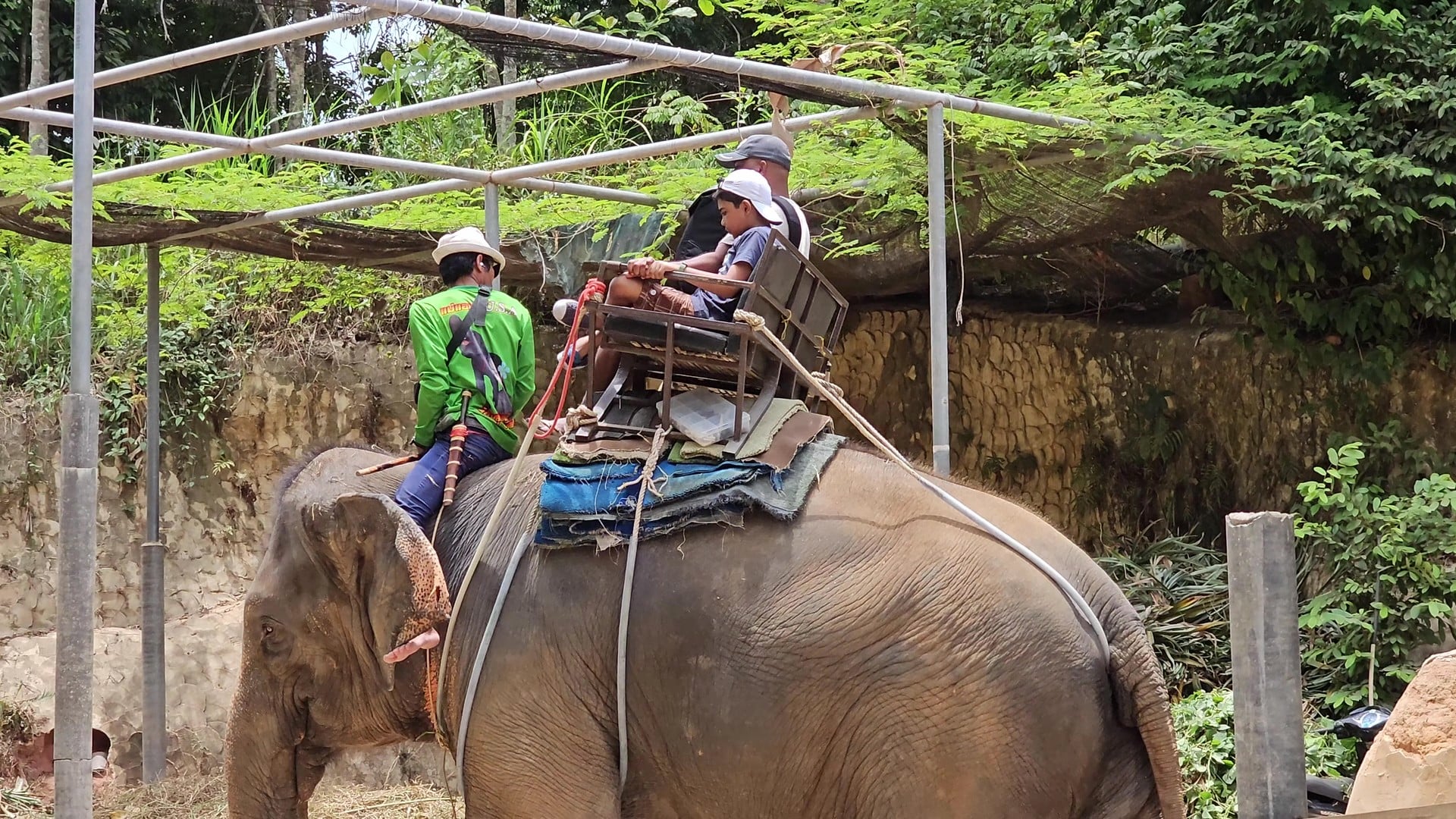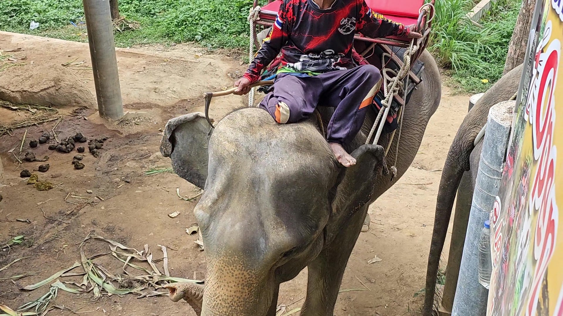 Οι αλυσοδεμένοι γίγαντες δεν βρίσκονται μακριά από τον Big Buddha. Είναι λίγο πιο κάτω, πάνω στον δρόμο, εκεί που το βλέμμα ακόμα κουβαλά τη σιωπή του λόφου. Οι λεγόμενοι “Big elephants” περιμένουν υπομονετικά δεμένοι από τα πόδια τους με κοντά σχοινιά, έτοιμοι να σε ανεβάσουν στην πλάτη τους για μια ακόμη βόλτα. Μια εμπειρία που παρουσιάζεται σαν αθώα, σχεδόν παραδοσιακή – αλλά δεν είναι.