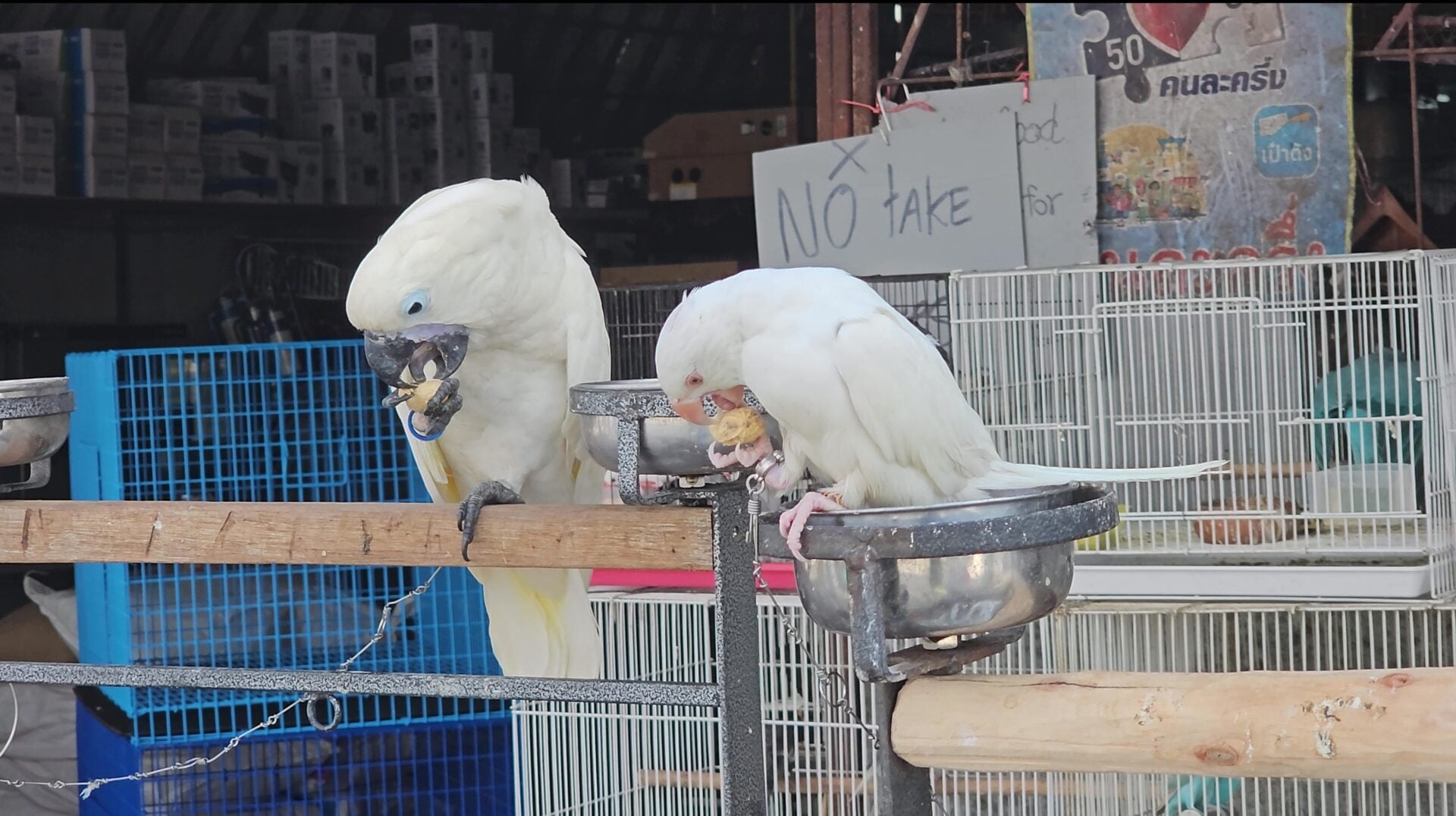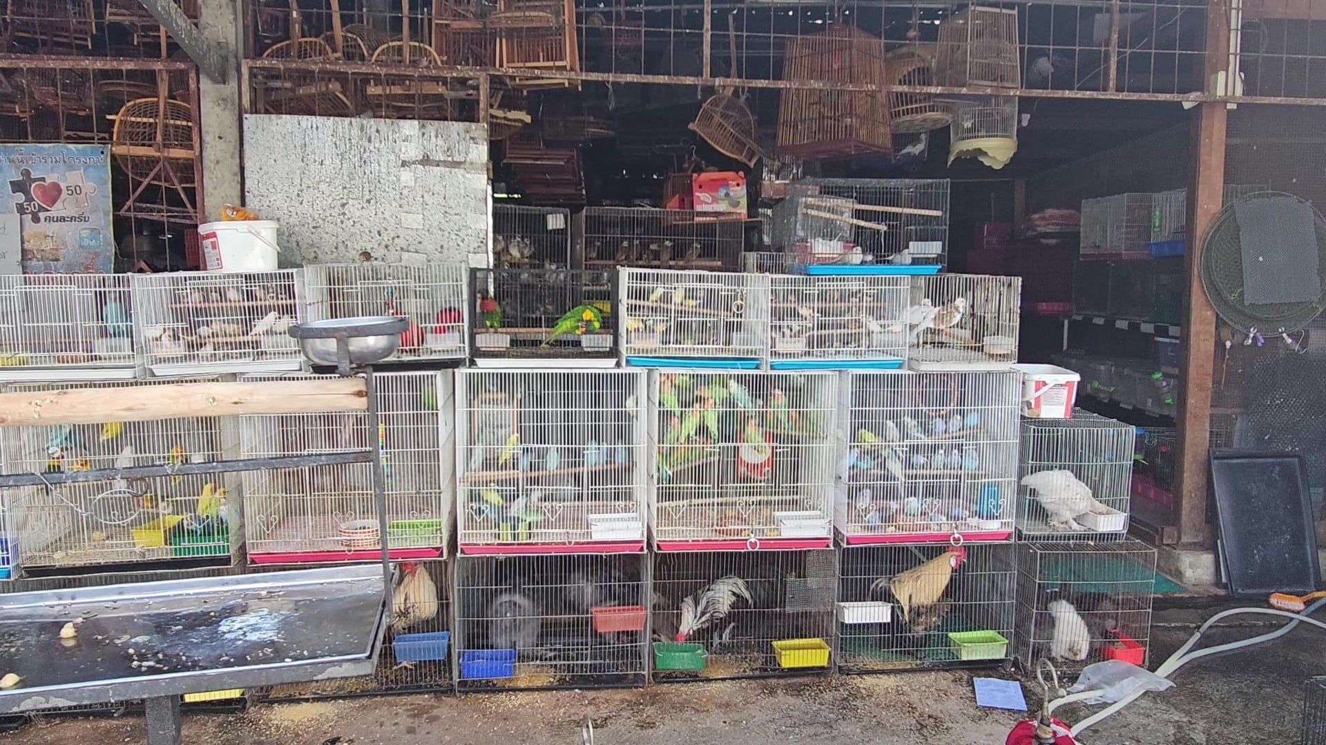 Πίσω από τις βιτρίνες, η άγρια ζωή έχει μετατραπεί σε εμπόρευμα: πουλιά στοιβαγμένα σε μικρά κλουβιά, εξωτικά είδη όπως παπαγάλοι cockatoo, που προστατεύονται διεθνώς και ζώα που δεν ανήκουν σε αυτό το περιβάλλον.