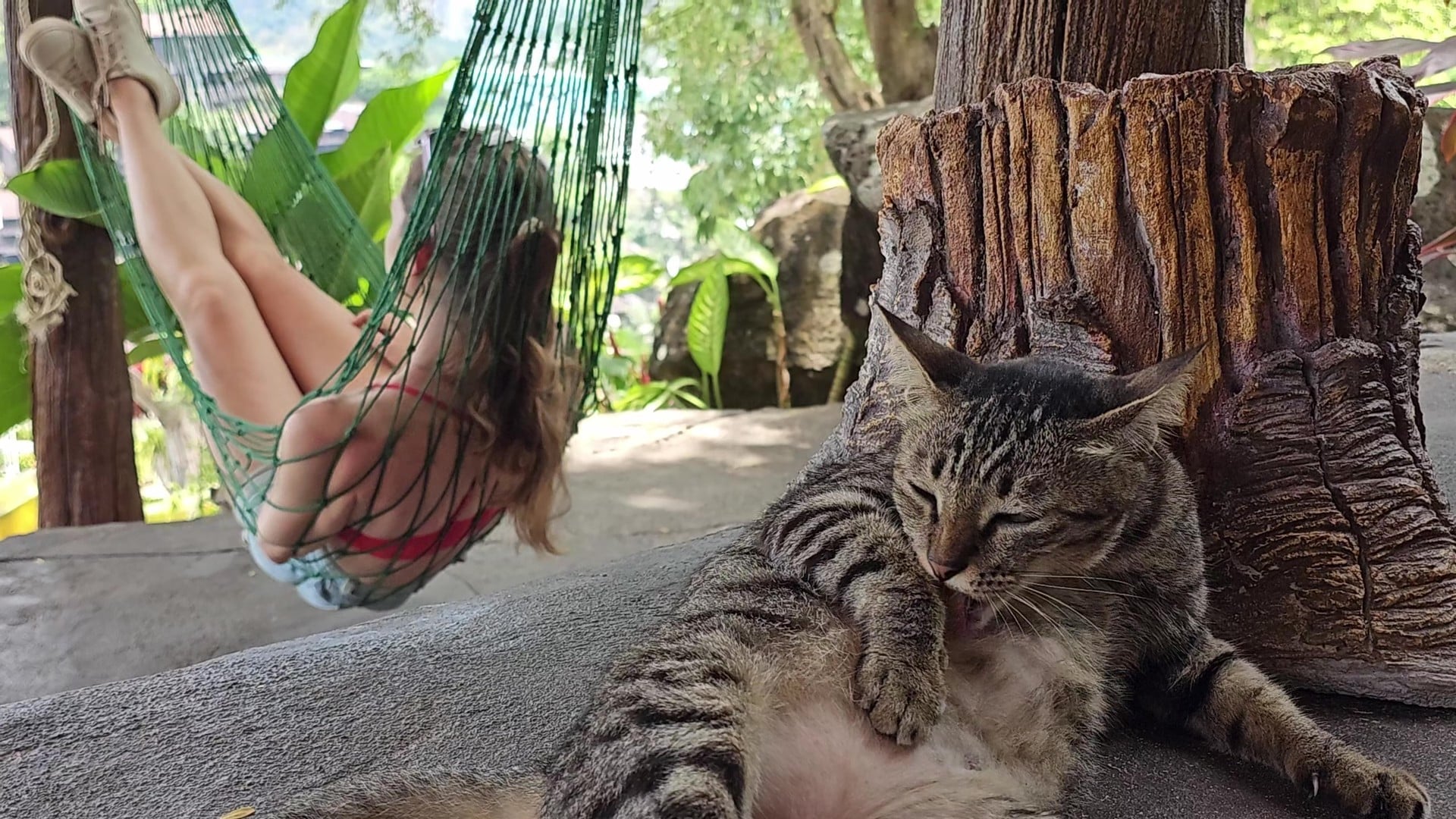 Και μέσα σε αυτή την ησυχία θα συναντήσεις πολλές γάτες. Ξαπλωμένες παντού. Στις πέτρες, στις ρίζες των δέντρων, δίπλα στις αιώρες. Δεν φοβούνται, δεν βιάζονται. Σε κοιτάζουν για λίγο, έρχονται κοντά, δέχονται το χάδι και μετά επιστρέφουν στη δική τους ακινησία.
