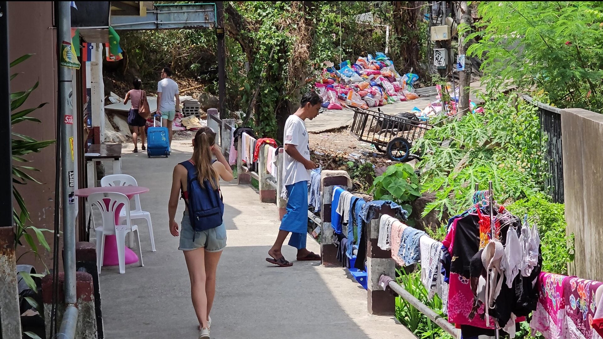 Κατεβαίνοντας από τον λόφο-μνημείο προς το χωριό, περάσαμε μέσα από τις εργατικές συνοικίες του Phi Phi. Εδώ δεν είναι το νησί που βλέπεις στις φωτογραφίες. Είναι ένα άλλο νησί που ζει αλλιώς.