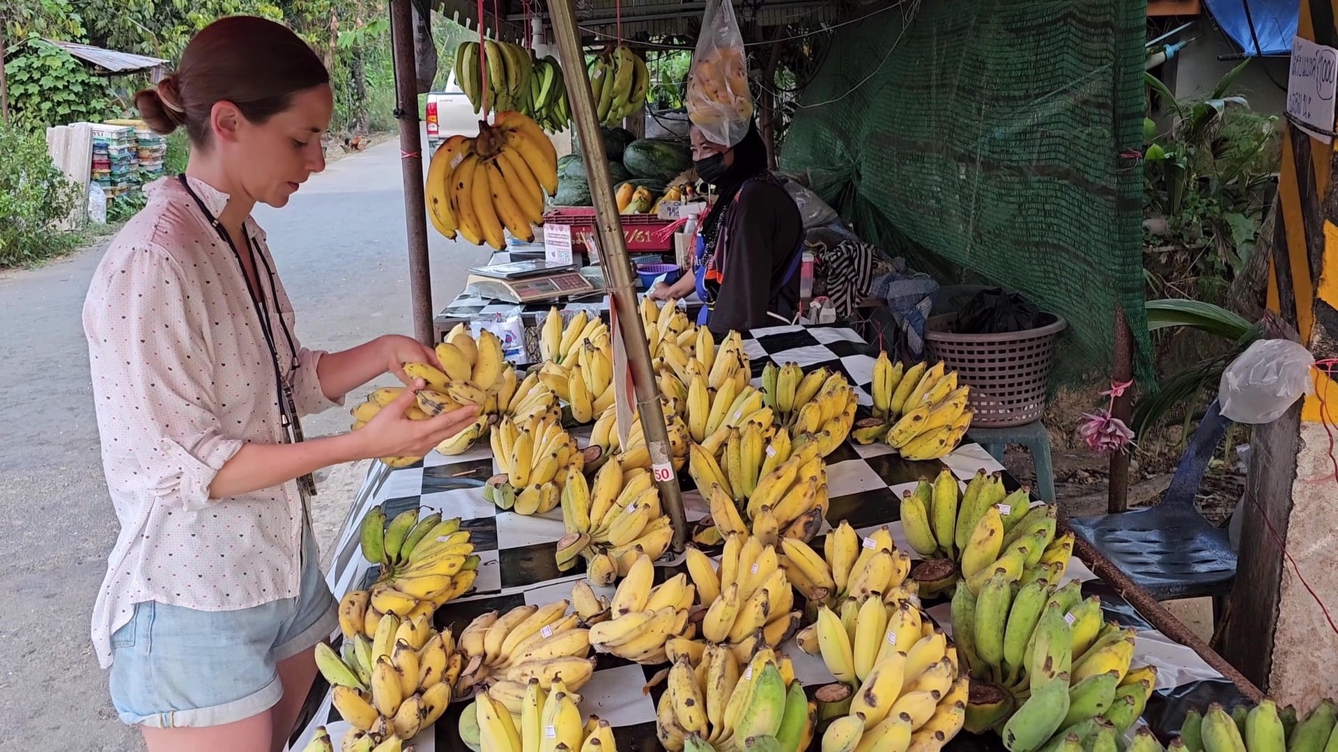Μετά βγαίναμε έξω και δίπλα μας ήταν η κυρία με τι τοπικές μπανάνες της Ταϊλάνδης. Μικρές, αρωματικές, με έντονη γεύση και μικρούς σπόρους μέσα — τελείως διαφορετικές από αυτές που είχαμε συνηθίσει. Είναι παλαιότερες τοπικές ποικιλίες πιο κοντά στην «αρχική» μορφή της μπανάνας. Έγιναν από την αρχή το αγαπημένο μας πρωινό φρούτο.