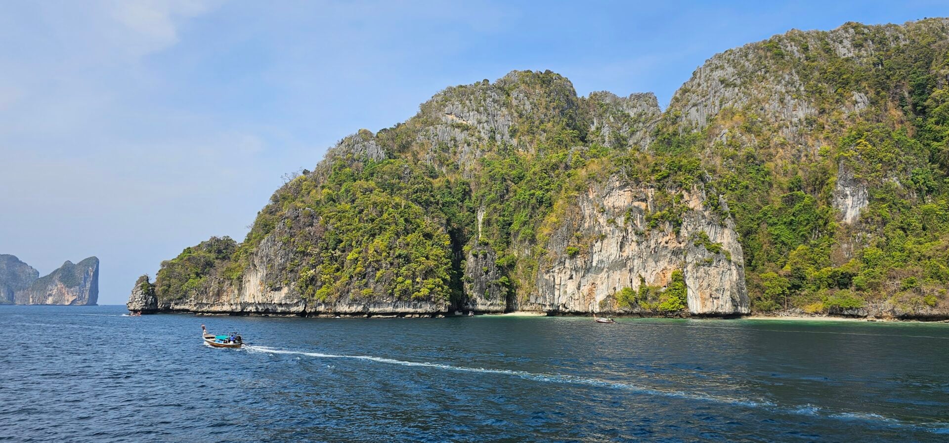 Μπήκαμε σε ένα μικρό τοπικό καραβάκι με κατεύθυνση το νησί Koh Lanta. Βρίσκεται στη θάλασσα Ανταμάν, στη δυτική πλευρά της νότιας Ταϊλάνδης — μια θάλασσα γεμάτη νησιά, σπηλιές και απότομους βράχους που μοιάζουν να ξεπηδούν κατευθείαν από το νερό.