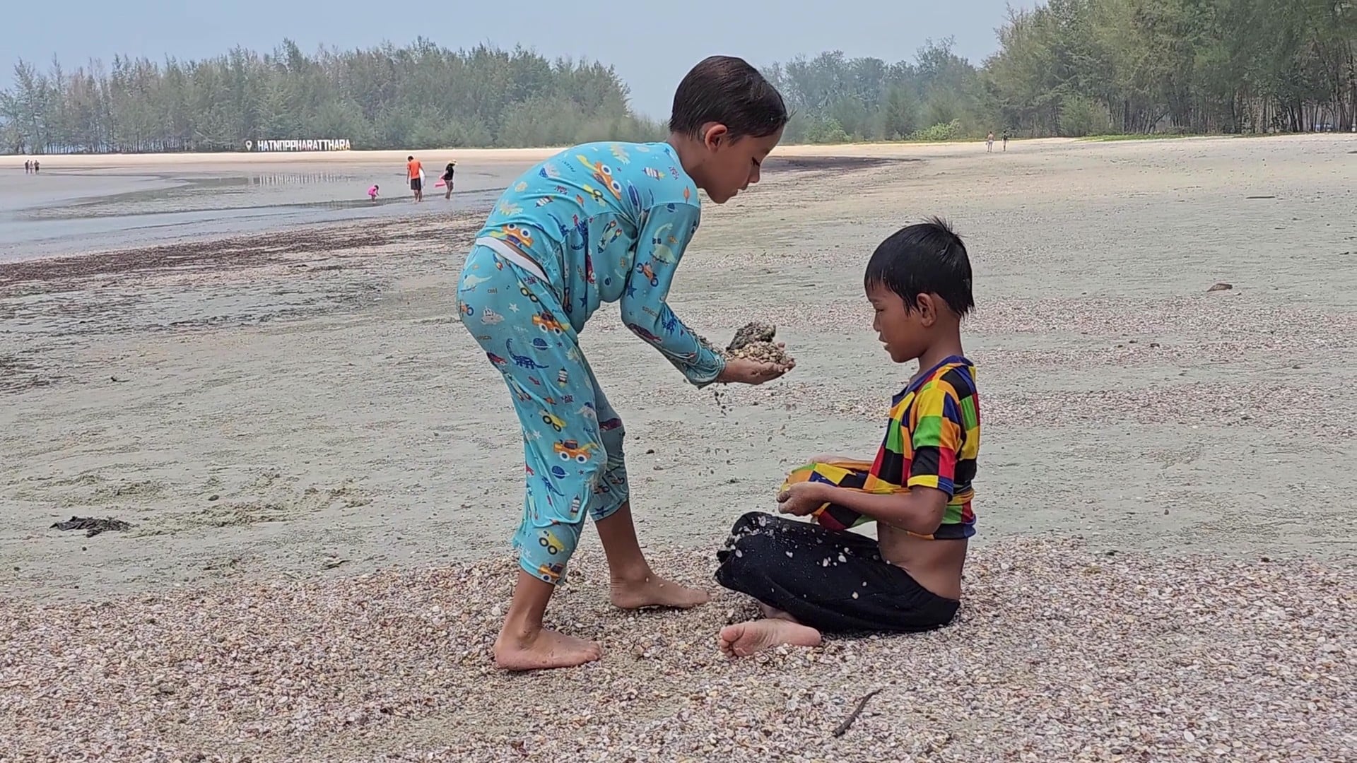 Παιδιά παίζουν στην άμμο, συχνά ακόμα με τις πιτζάμες τους, σκάβουν, γελάνε, γεμίζουν τα χέρια τους με άμμο σαν να μην υπάρχει τίποτα άλλο στον κόσμο εκείνη τη στιγμή.