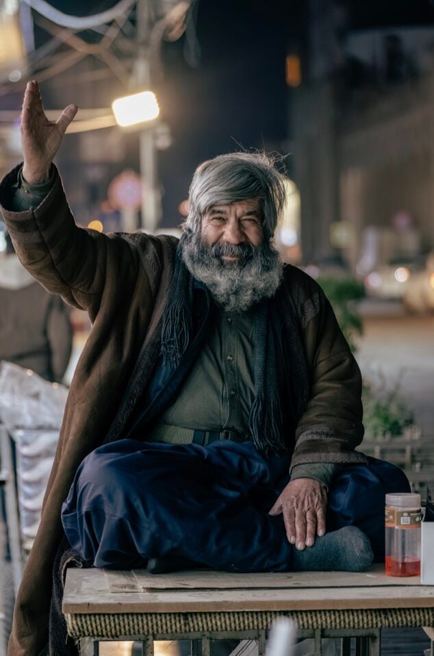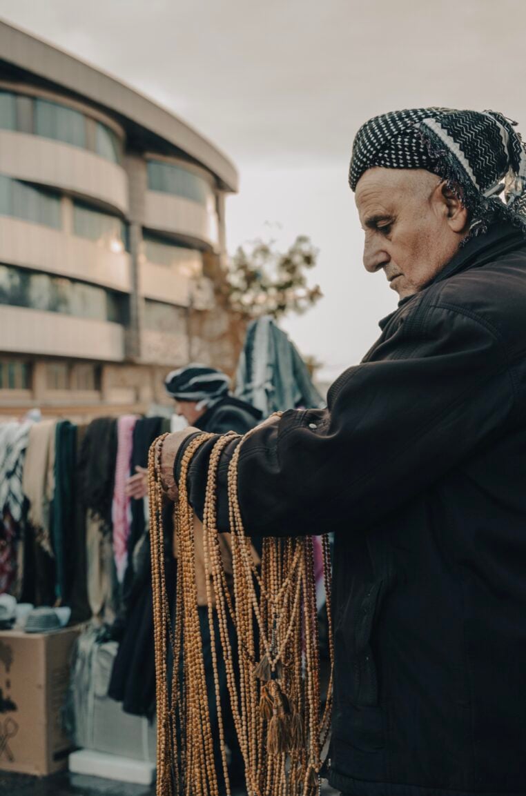 Ηλικιωμένος στη Σουλειμανίγια (Κουρδιστάν), πουλάει τα ξύλινα κομπολόγια του στην αγορά. Χαρακτηριστικό στοιχείο τους, το πολύ μεγάλο μήκος τους.