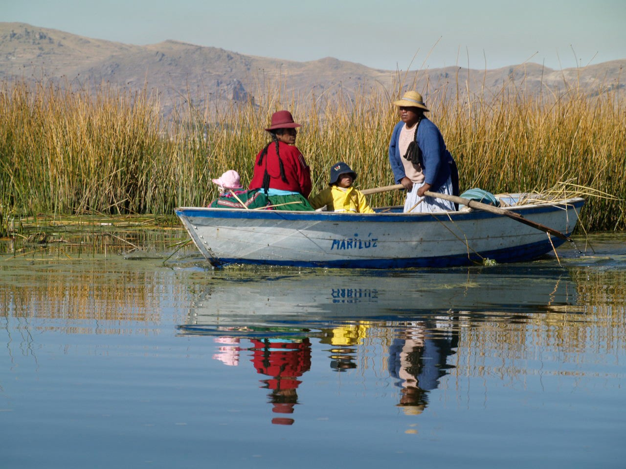 Σιγά σιγά αρχίσαμε να συναντάμε βάρκες. Μικρές, άλλες με κουπιά, άλλες με μηχανή. Πολλές τις οδηγούσαν γυναίκες, ντυμένες με τη χαρακτηριστική περουβιανή ενδυμασία: έντονα χρώματα, πλεκτά καπέλα, υφάσματα που ακολουθούσαν τον άνεμο.