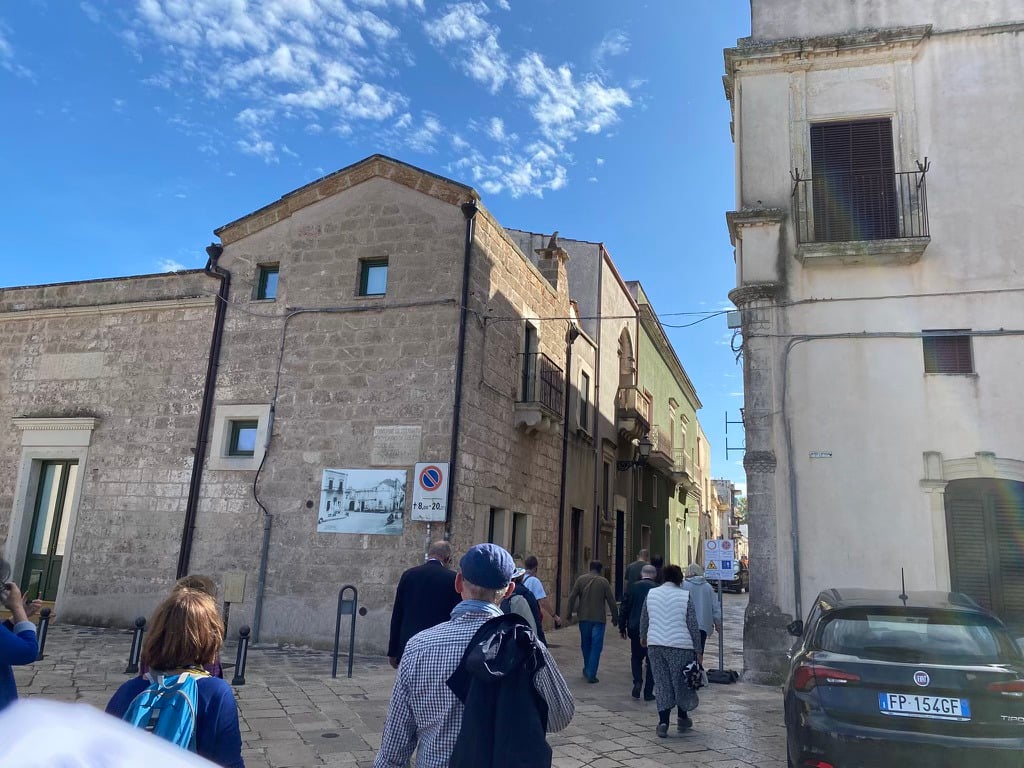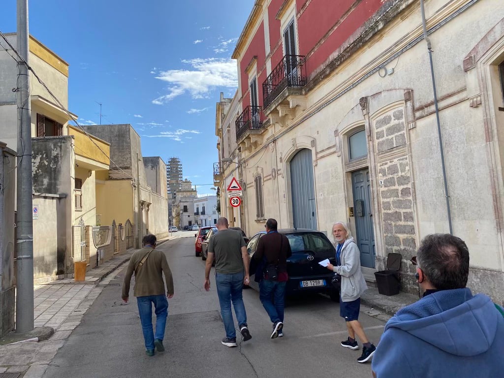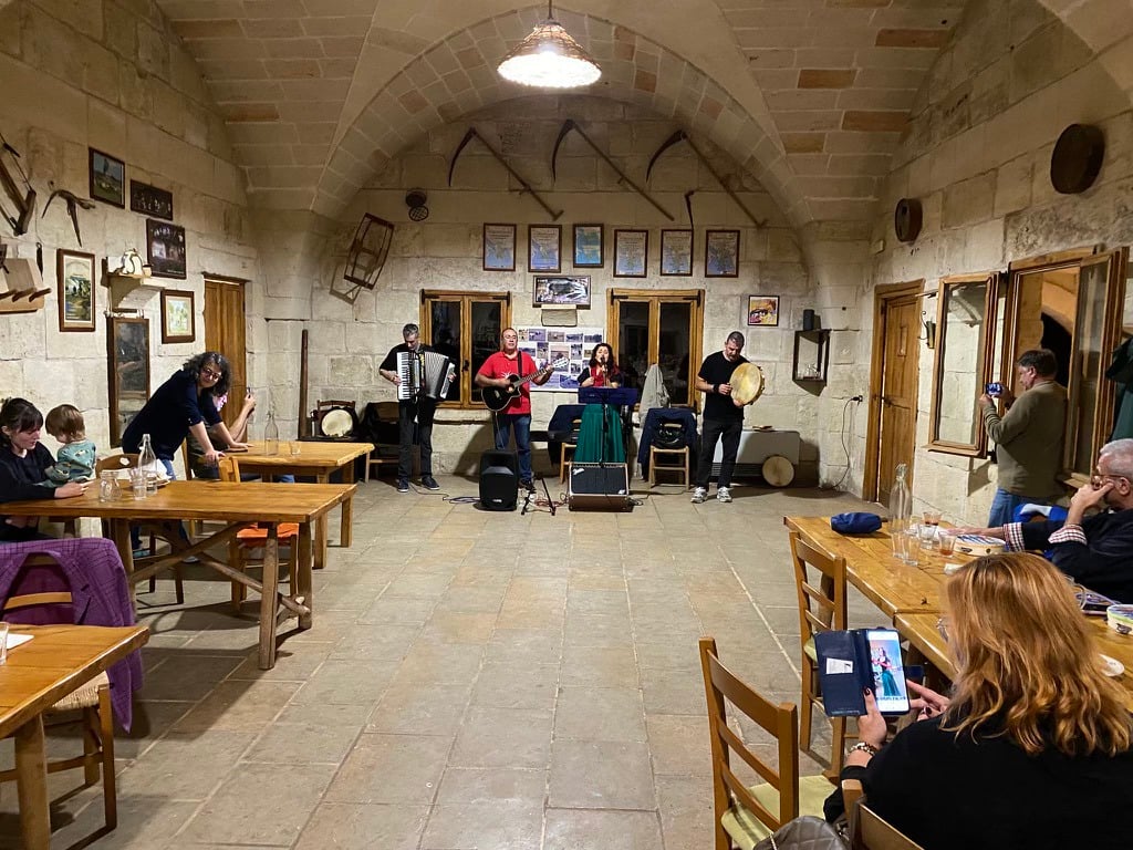 Το βράδυ ο Giorgio Filieri έπαιξε για μας με το μουσικό συγκρότημα που έχει φτιάξει (τα Αστέρια) τραγούδια της περιοχής γκρεκάνικα και ιταλικά (πιο σωστά σε διάλεκτο της Απουλίας) σε ένα αγρόκτημα, που έχει και παραδοσιακό (χωρίς ίχνος νεωτερικών προσθηκών) εστιατόριο και το οποίο ονομάζεται Masseria San’ Angelo και ιδιοκτήτης του οποίου είναι ένας άλλος γκρεκάνος που έχει ζήσει στην Ελλάδα ο Rocco. Περιττό να πω πόση συγκίνηση και ενθουσιασμό προκάλεσε στην παρέα μας αυτή η μουσική βραδιά και η συνεύρεση αυτή. Δημιουργήθηκε κλίμα αδελφοσύνης και σηκωθήκαμε σιγά ένας ένας, ακόμη και οι πιο διστακτικοί (όπως εγώ) και αρχίσαμε να χορεύουμε αυτοσχέδια ταραντέλλες. Εγώ βέβαια υπήρξα ο χειρότερος χορευτής απ’ όλους.